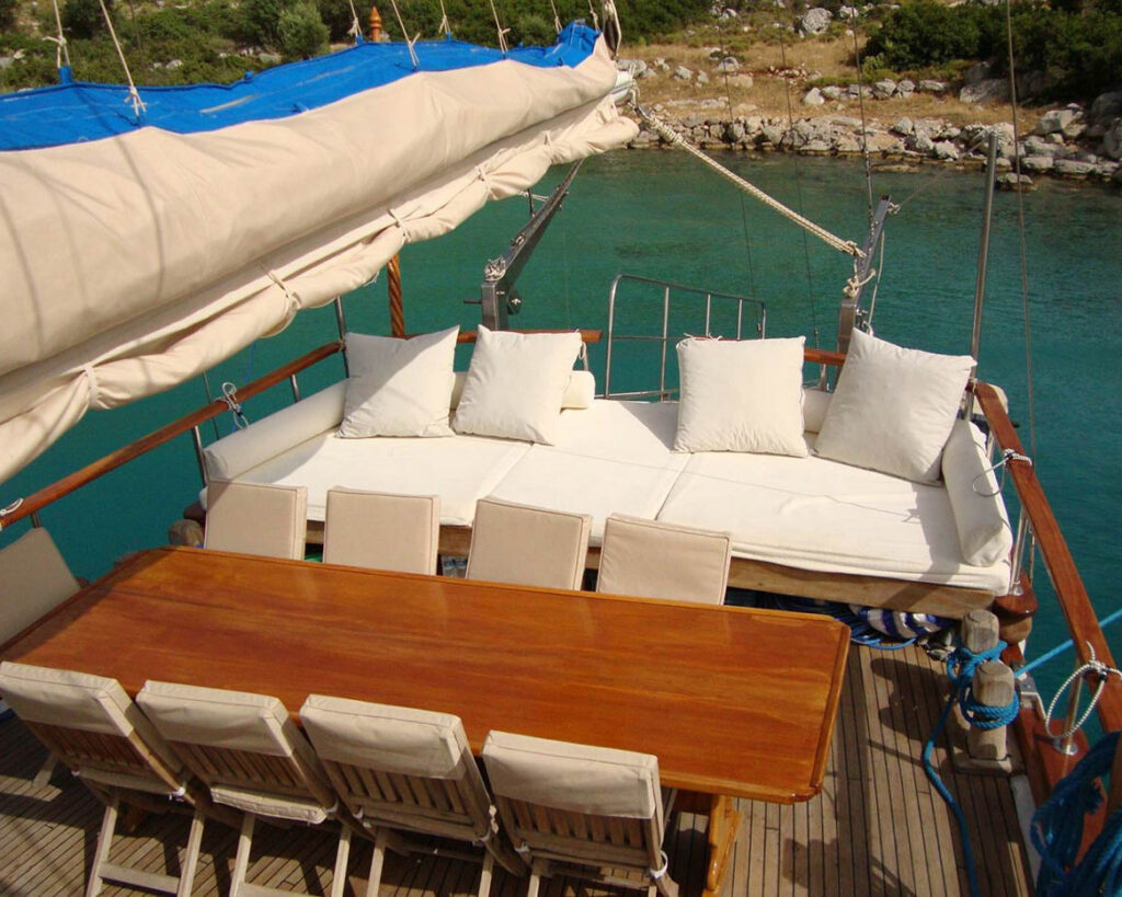 The vessel's exterior spaces are designed for relaxation and social interaction, featuring spacious cushioned seating areas and dining facilities on the aft deck perfect for outdoor meals and sunset cocktails. The forward areas provide peaceful spaces for sunbathing with premium sun mattresses, while deck showers offer refreshing rinses after swimming in crystal-clear Turkish waters.