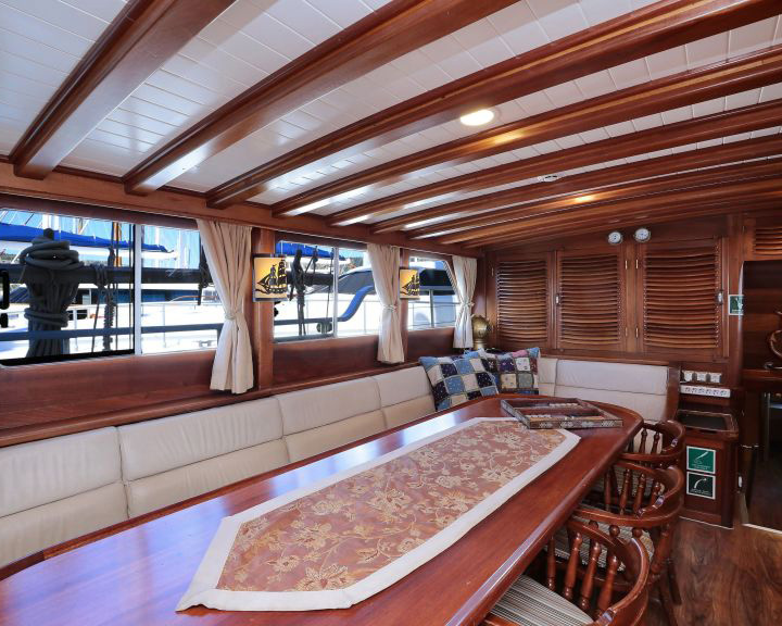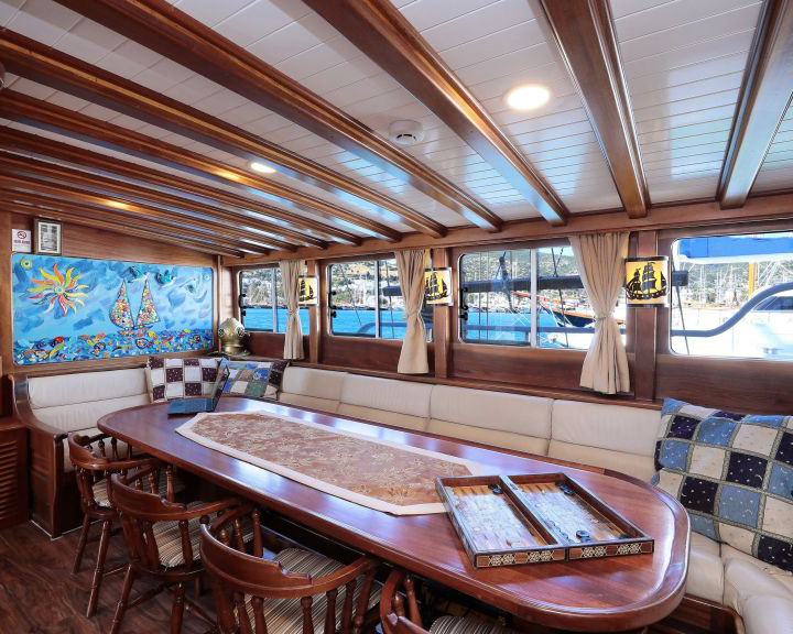 Aegean Clipper's interior design showcases exquisite wooden craftsmanship and traditional Turkish gulet styling enhanced with contemporary amenities and comfort features. The spacious, air-conditioned salon provides a comfortable retreat with panoramic windows, elegant seating areas, entertainment systems including TV, DVD player, and premium music system with iPod connection. The salon also features a formal dining area that accommodates all guests comfortably, creating an ideal space for group meals and socializing.