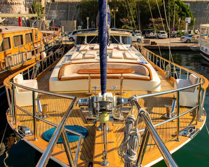 The spacious salon is bright and welcoming, featuring a TV, sound system, and complimentary internet. The aft deck offers a large lounging area with an 8-person dining table for delicious meals, while the foredeck provides ample space for sunbathing and relaxation.