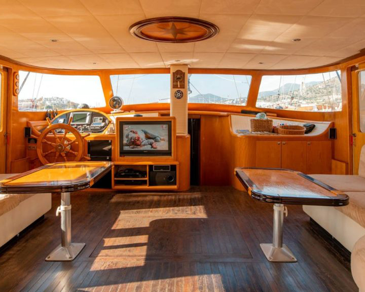 The salon boasts a TV, sound system, and free internet, along with a bright and airy design, enhancing the relaxation experience while cruising from Bodrum.
