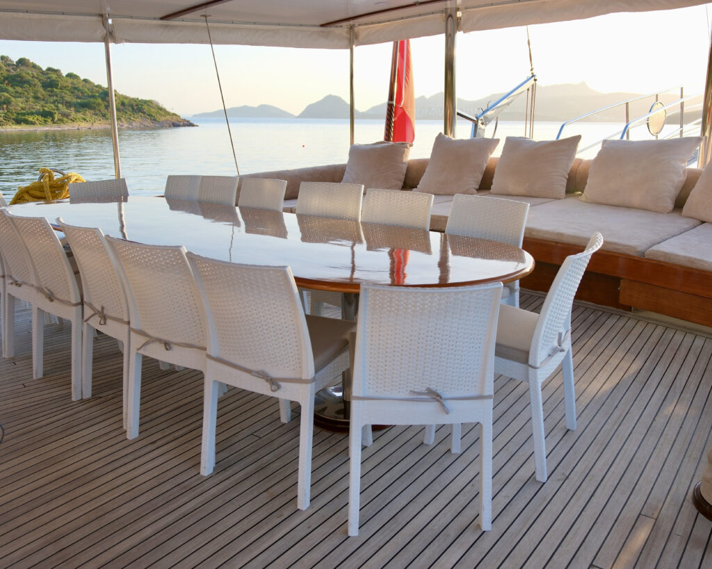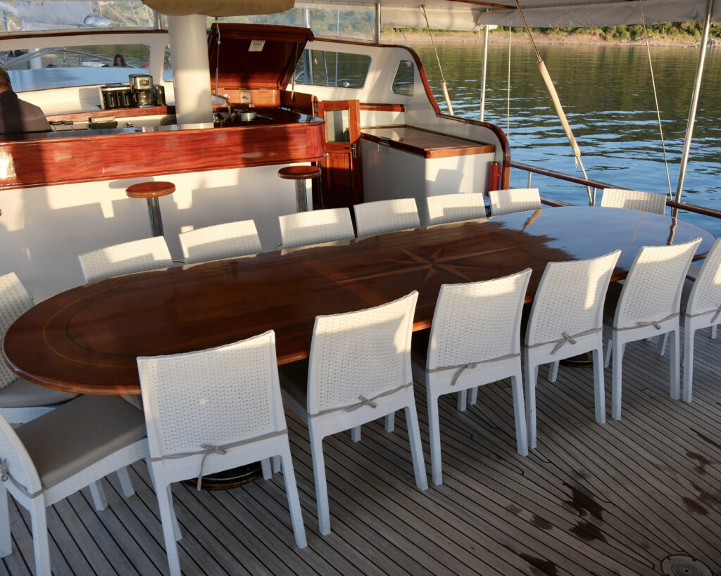 Large aft deck dining area with seating for 18 guests