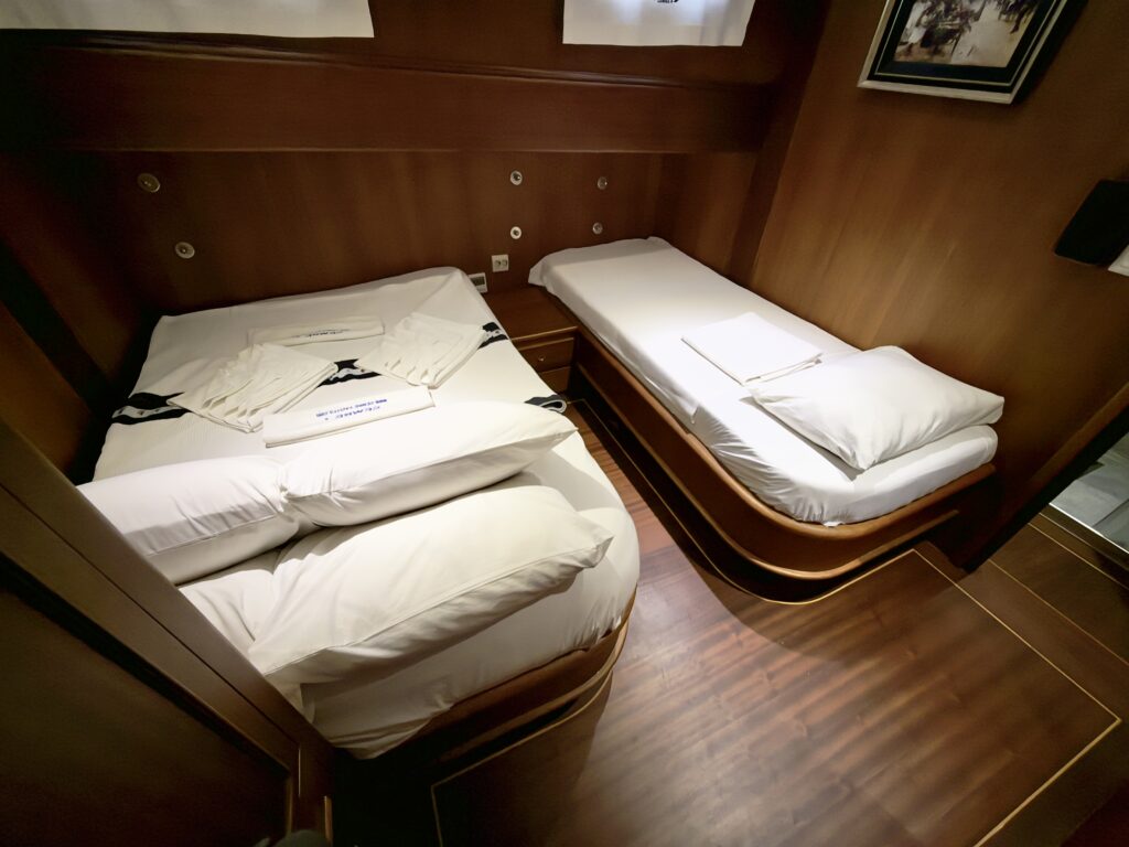 The vessel features nine beautifully appointed cabins that can accommodate up to 18 guests, including one master cabin with a king-sized bed, six double cabins, and two triple cabins with flexible sleeping arrangements. Each cabin serves as a private retreat equipped with en-suite bathrooms featuring shower, WC, and hairdryer, individually controlled air conditioning, and modern amenities to ensure maximum comfort throughout your journey.