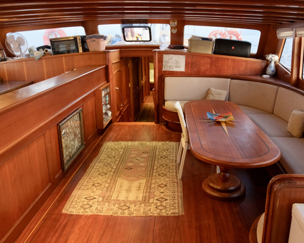 Cemre 4's interior design showcases rich wooden paneling with contemporary styling, creating an atmosphere of understated elegance throughout the vessel. The spacious salon features comfortable seating areas, flat-screen TV, DVD player, music system, and panoramic windows that flood the space with natural light. The formal dining area provides generous seating with beautiful furnishings and integrated entertainment facilities, while the fully equipped American bar complements the professional galley perfectly.