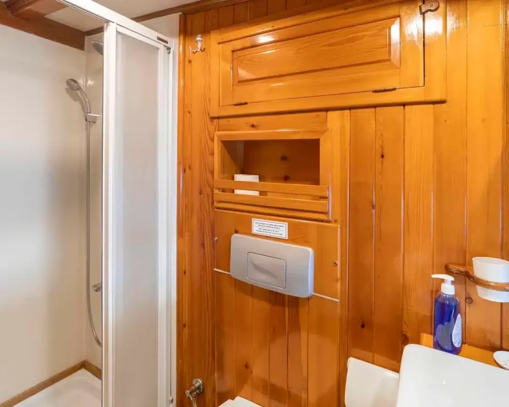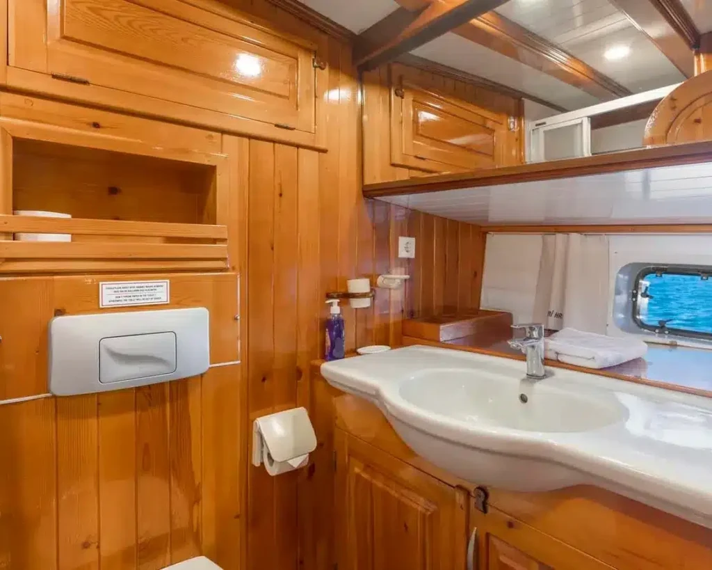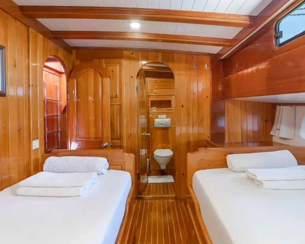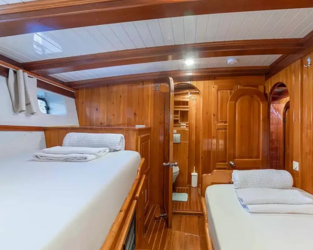 The vessel features six beautifully appointed cabins that accommodate up to 12 guests, offering flexible sleeping arrangements with two luxury double cabins, two twin cabins, and two triple cabins. Each cabin serves as a private sanctuary equipped with en-suite bathrooms, individually controlled air conditioning, and modern amenities designed for maximum comfort during your blue cruise adventure.