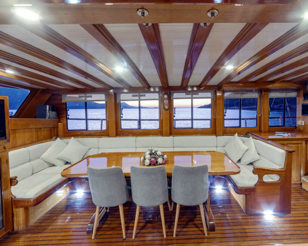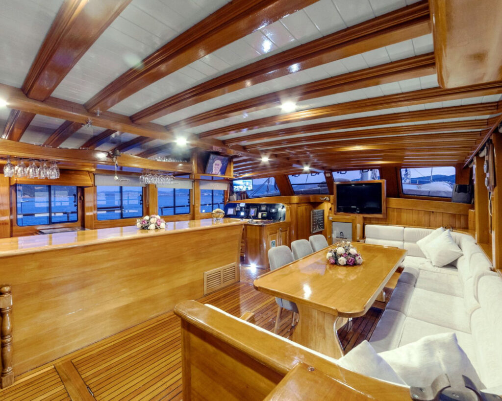 Cevri Hasan 5's construction features a magnificent mahogany hull, beautiful teak decks, and elegant Russian pine interior paneling, creating an atmosphere of sophisticated luxury throughout. The spacious salon features panoramic windows, classic furnishings with modern touches, and integrated entertainment systems, while the formal dining areas both indoor and outdoor provide comfortable settings for memorable meals with stunning coastal views.