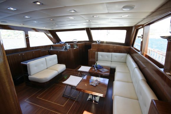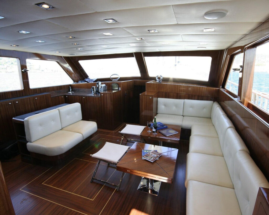 Didi's interior design showcases elegant mahogany wood throughout, creating an atmosphere of refined luxury and warmth. The spacious salon combines classic timber styling with contemporary comfort, featuring comfortable seating areas for relaxation and indoor dining when weather calls for it. The salon offers widescreen TV entertainment and music systems for guest enjoyment.