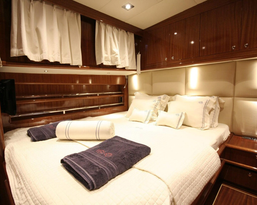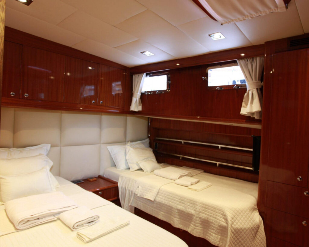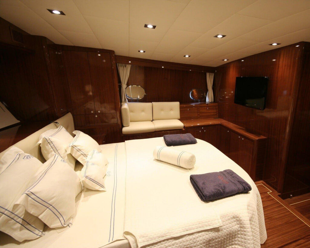 The vessel accommodates up to 8 guests in four beautifully appointed cabins, offering flexible luxury arrangements with two master cabins featuring king-sized beds, one double cabin, and one twin cabin that can be converted as needed. Each cabin serves as a private sanctuary with marble en-suite bathrooms, individually controlled air conditioning, LCD TV with satellite reception, and premium audio systems throughout.