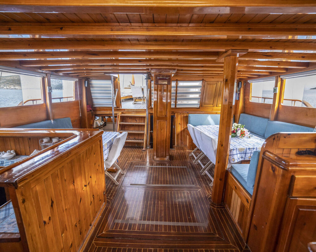 Fatoş's interior showcases authentic Turkish gulet design with rich wooden paneling and traditional craftsmanship throughout the main salon. The central gathering space features comfortable seating arrangements around a formal dining table, creating an inviting atmosphere for shared meals and social interaction. Modern conveniences include television, DVD player, and music system, while natural light and ventilation maintain the classic gulet ambiance that charter guests cherish.