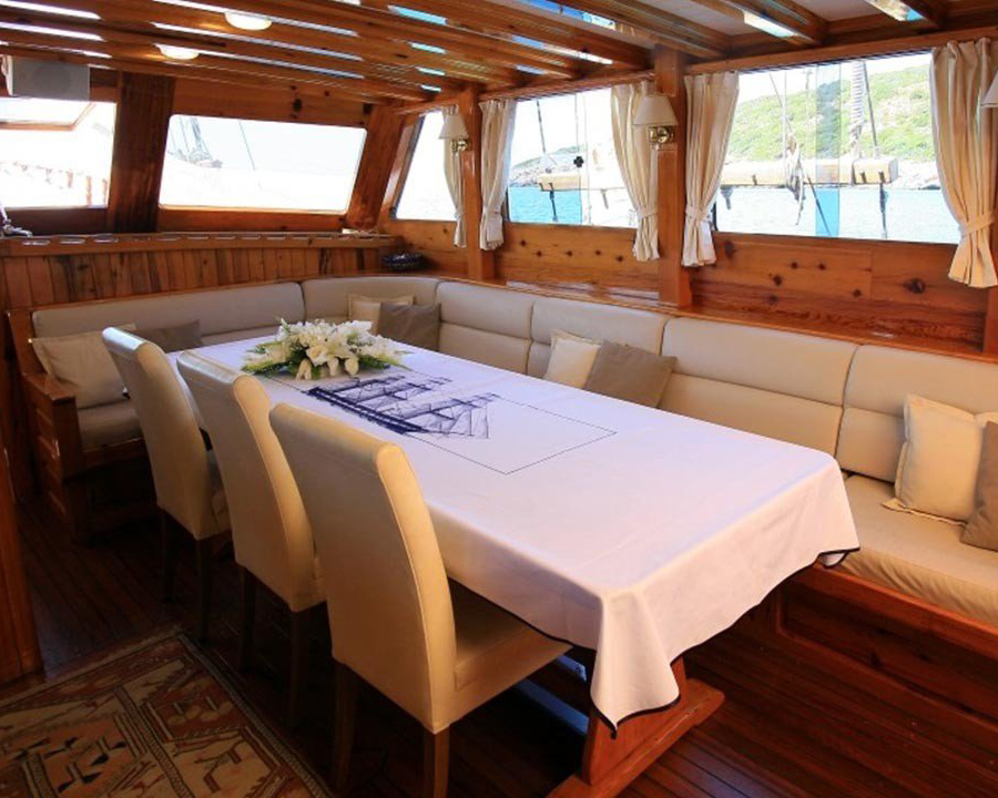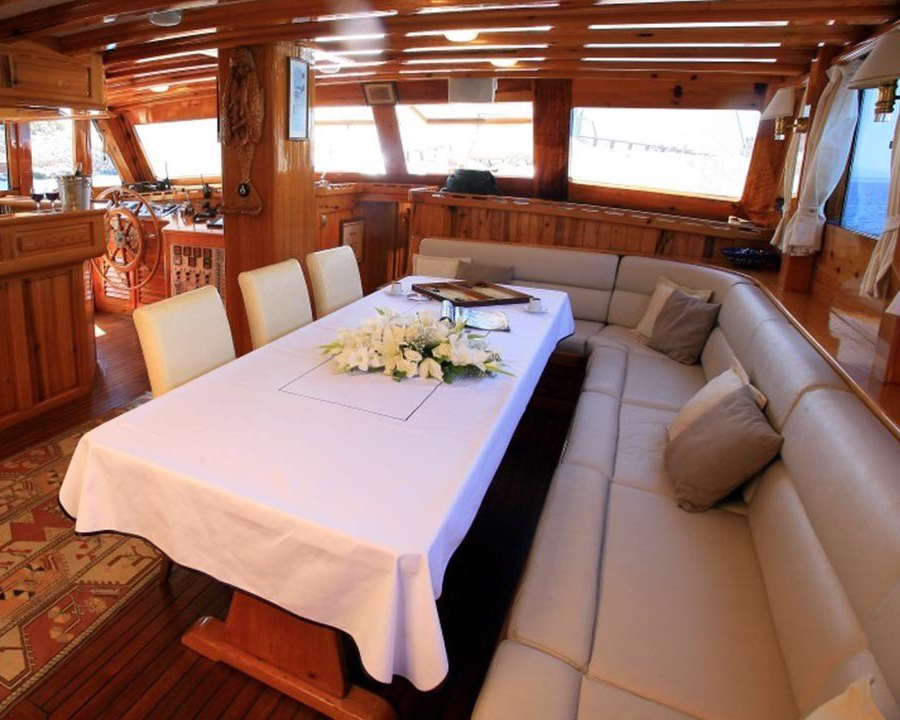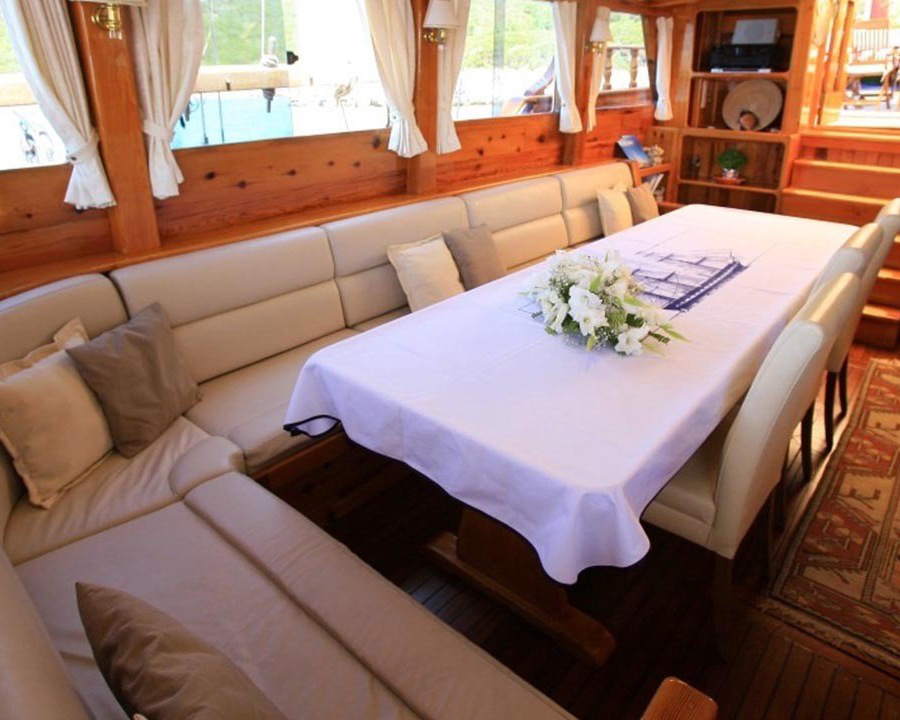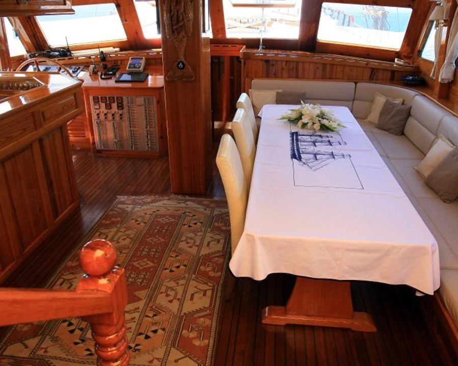 Kaya Güneri 2's interior features a comfortable salon with dinette and bar facilities, providing an ideal space for relaxation, socializing, and indoor dining during your cruise. The vessel includes a fully equipped separate galley where the skilled chef prepares delicious meals using fresh local ingredients, while entertainment options include music systems with CD player, LCD TV, DVD player, and various games including backgammon and cards for evening enjoyment.