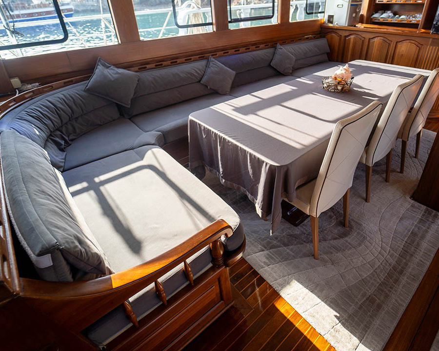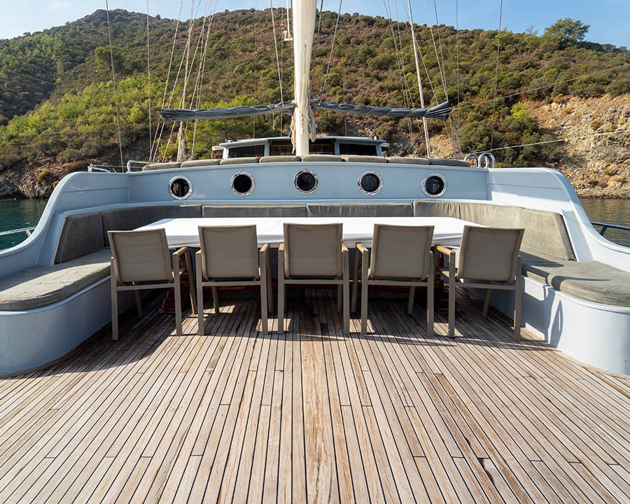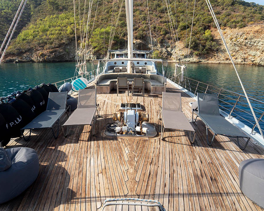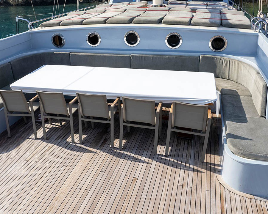 Prenses Lila's exterior spaces are equally impressive, with extensive teak decking providing multiple areas for relaxation and entertainment. The generous 7.6-meter beam creates wide, stable deck areas perfect for group activities. The aft deck features comfortable seating and a full-beam sunpad, while the forward areas provide additional lounging space and dining options under retractable awnings.