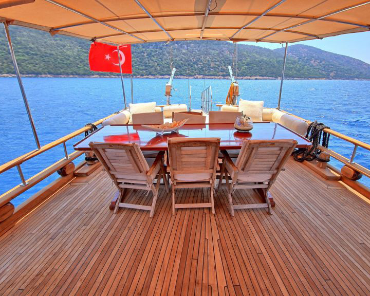 Sudenaz's exterior layout has been carefully planned to maximize enjoyment of the outdoor Mediterranean lifestyle that defines the blue cruise experience. The generous aft deck features a large cushioned seating area perfect for relaxation, along with a dedicated dining table and dining space where guests can enjoy memorable alfresco meals while taking in spectacular coastal views. The vessel provides ample sunbathing space with comfortable cushions and adequate deck areas ensuring all guests have room to relax and soak up the Mediterranean sun.