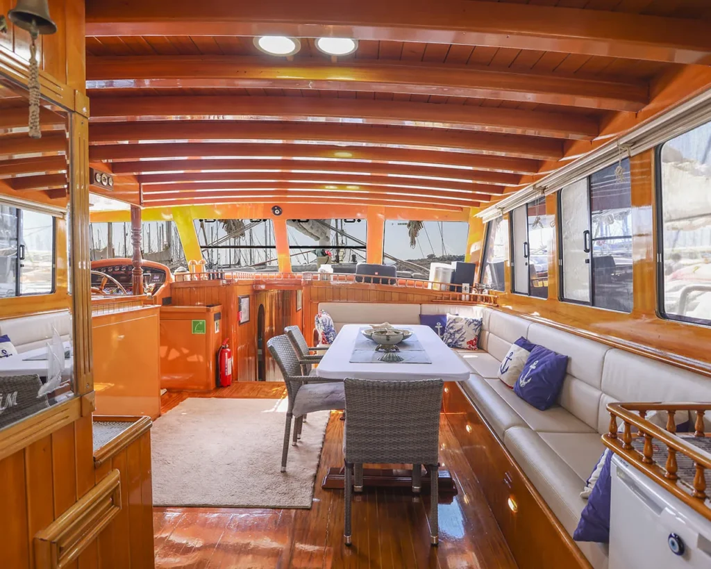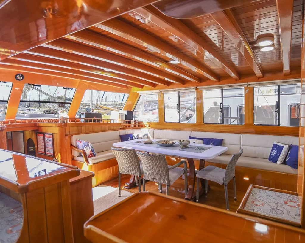 Ya Selam's interior showcases the finest traditions of Turkish maritime design, with rich teak flooring and paneling creating an atmosphere of timeless elegance throughout the main salon. The central gathering space features comfortable seating arrangements around a formal dining table, complemented by modern entertainment systems including television, comprehensive music system, and complimentary Wi-Fi connectivity. Natural light streams through traditional portlights, while air conditioning ensures comfort during the warmer Mediterranean months.