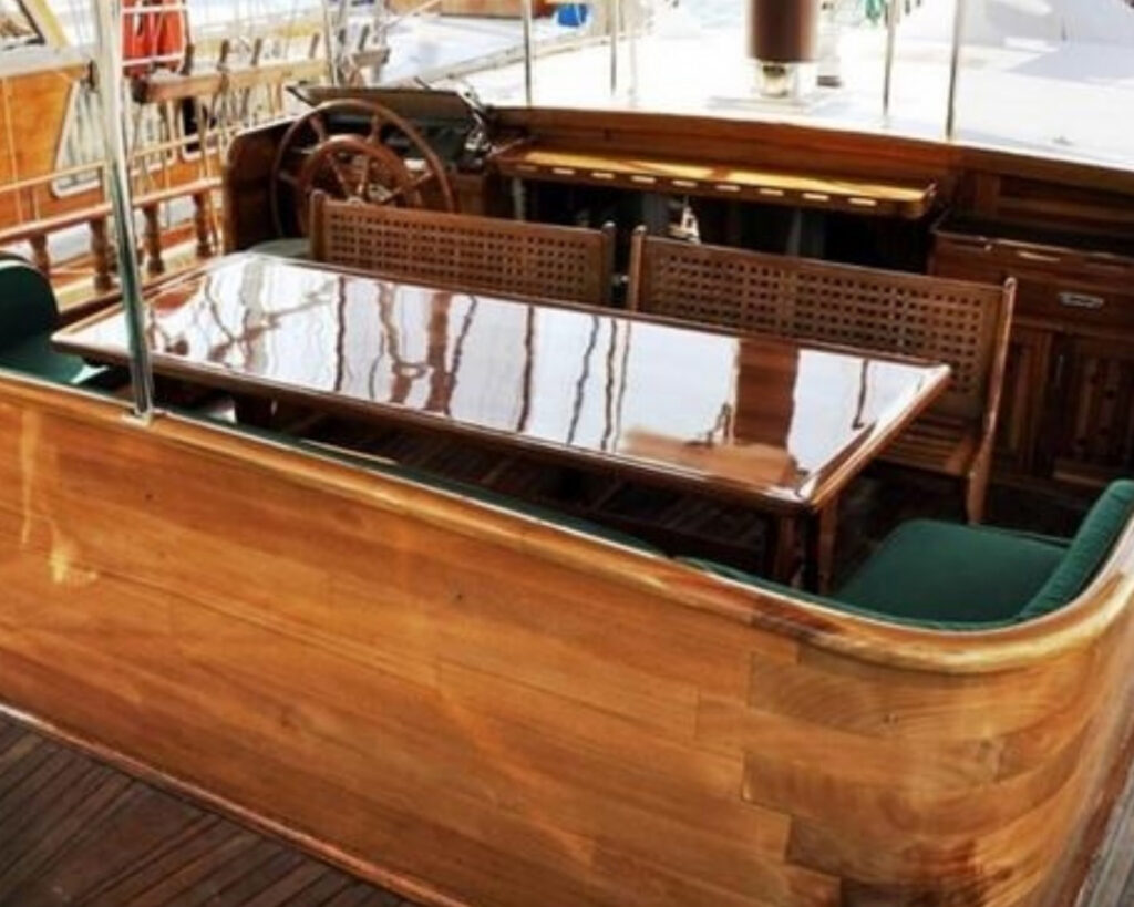 Das Innendesign der Aliko kombiniert reichhaltige Holzhandwerkskunst mit komfortablen, gut gestalteten Räumen. Der klimatisierte Salon bietet einen entspannten Aufenthaltsbereich mit Unterhaltungssystemen, während die Innen- und Außenbereiche vielseitige Möglichkeiten für Mahlzeiten und gesellige Aktivitäten bieten. Natürliches Licht und eine durchdachte Belüftung schaffen eine einladende Atmosphäre auf dem gesamten Schiff.