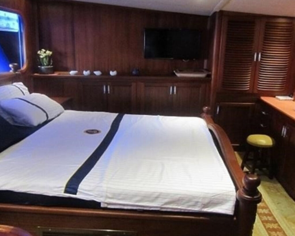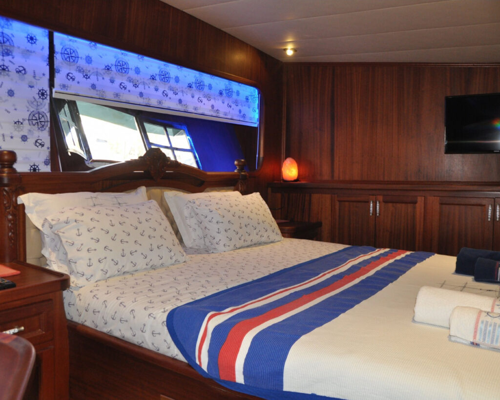 Das Schiff verfügt über sechs wunderschön eingerichtete Kabinen, die Platz für bis zu 12 Gäste bieten. Mit zwei geräumigen Master-Kabinen und vier Dreifachkabinen, die je nach den Bedürfnissen der Gruppe konfiguriert werden können, sind flexible Arrangements möglich. Jede Kabine dient als privater Rückzugsort und ist mit einem eigenen Bad, einer individuell regulierbaren Klimaanlage und modernen Annehmlichkeiten für maximalen Komfort und Privatsphäre ausgestattet.