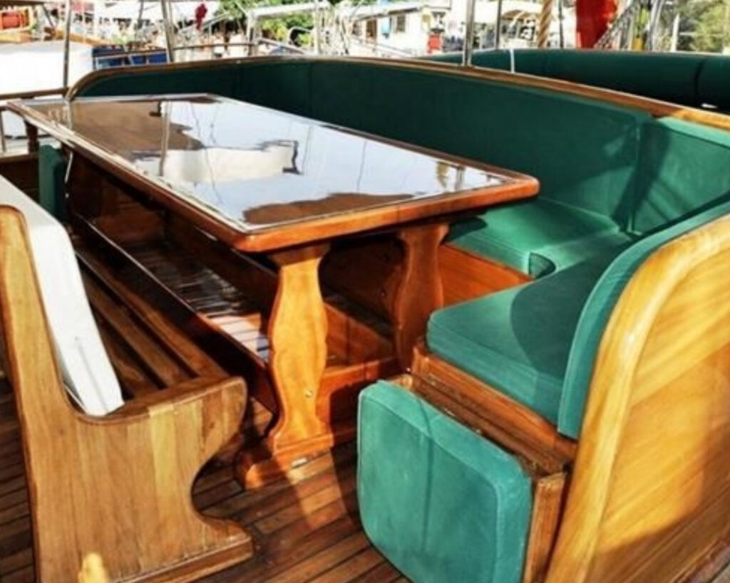 Die Außenbereiche des Schiffes verfügen über großzügige Decksflächen mit bequemen Sitz- und Essgelegenheiten. Weitläufige Sonnenbereiche bieten reichlich Platz zum Entspannen, während die gut durchdachte Aufteilung einen einfachen Wechsel zwischen den verschiedenen Bereichen des Bootes gewährleistet. Das traditionelle Gulet-Design bietet sowohl überdachte als auch offene Bereiche, die für alle Wetterbedingungen geeignet sind.