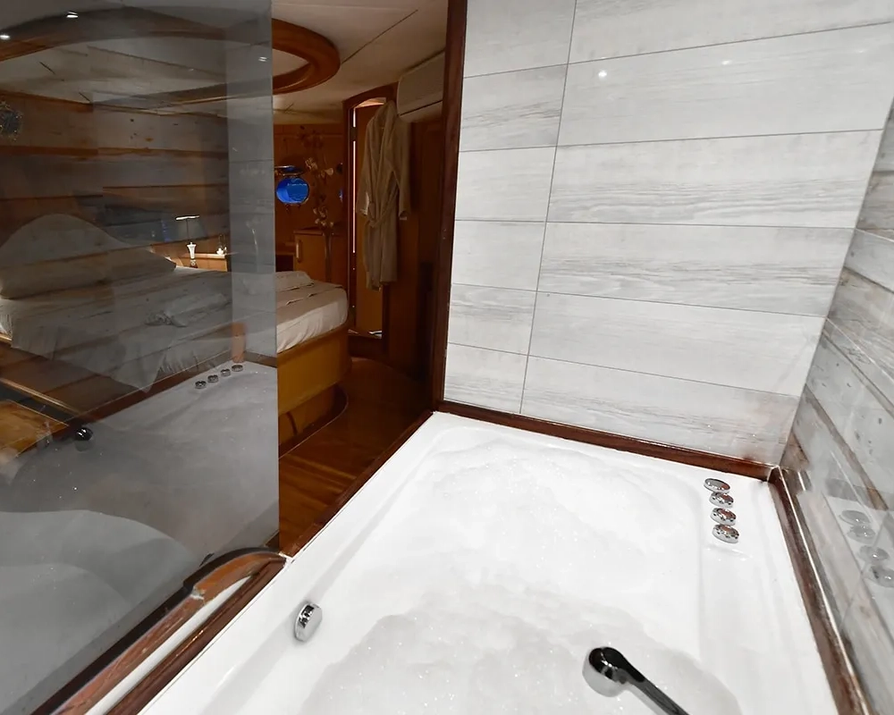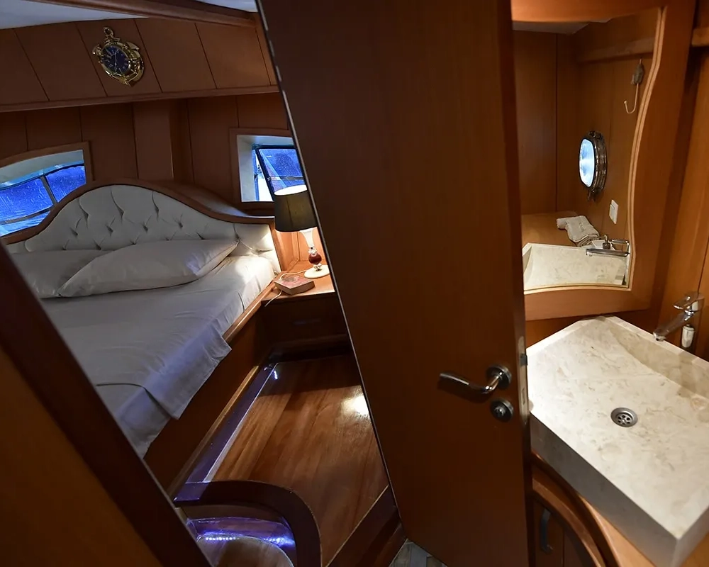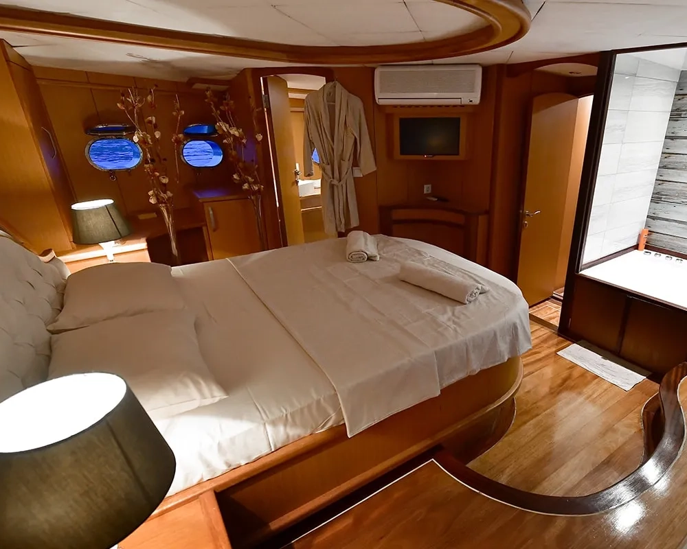 Das Schiff bietet Platz für bis zu 8 Gäste in vier wunderschön eingerichteten Kabinen, darunter zwei geräumige Master-Suiten und zwei flexible Zweibettkabinen, die je nach Wunsch der Gäste leicht in Doppelkabinen umgewandelt werden können. Jede Kabine wurde als privater Rückzugsort konzipiert und verfügt über ein eigenes Badezimmer mit moderner Ausstattung, eine individuell regulierbare Klimaanlage für persönlichen Komfort, LCD-Fernseher mit DVD-Player, ein hochwertiges Musiksystem und elegante Möbel, die eine Atmosphäre von raffiniertem Luxus schaffen.