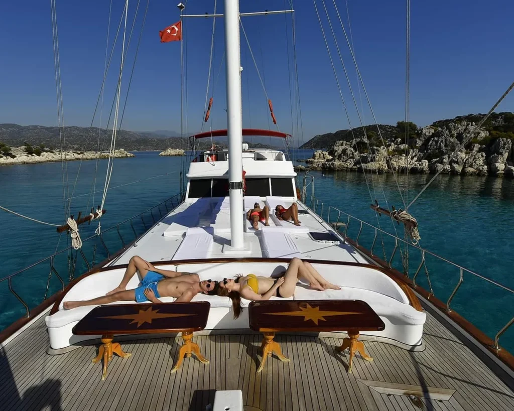 Die Außenbereiche des Schiffes wurden sorgfältig gestaltet, um den Gästen ein Höchstmaß an Genuss und Entspannung zu bieten. Das große Achterdeck bietet einen großzügigen Außenwohnbereich mit gepolsterten Sitzgelegenheiten und Essmöglichkeiten, ideal für Mahlzeiten im Freien und abendliche Zusammenkünfte. Das geräumige Sonnendeck bietet reichlich Platz zum Sonnenbaden mit hochwertigen Matratzen, die so positioniert sind, dass Sie die mediterrane Sonne genießen können, und bietet gleichzeitig komfortable Bereiche zum Lesen, Entspannen und Genießen der spektakulären Küstenlandschaft.