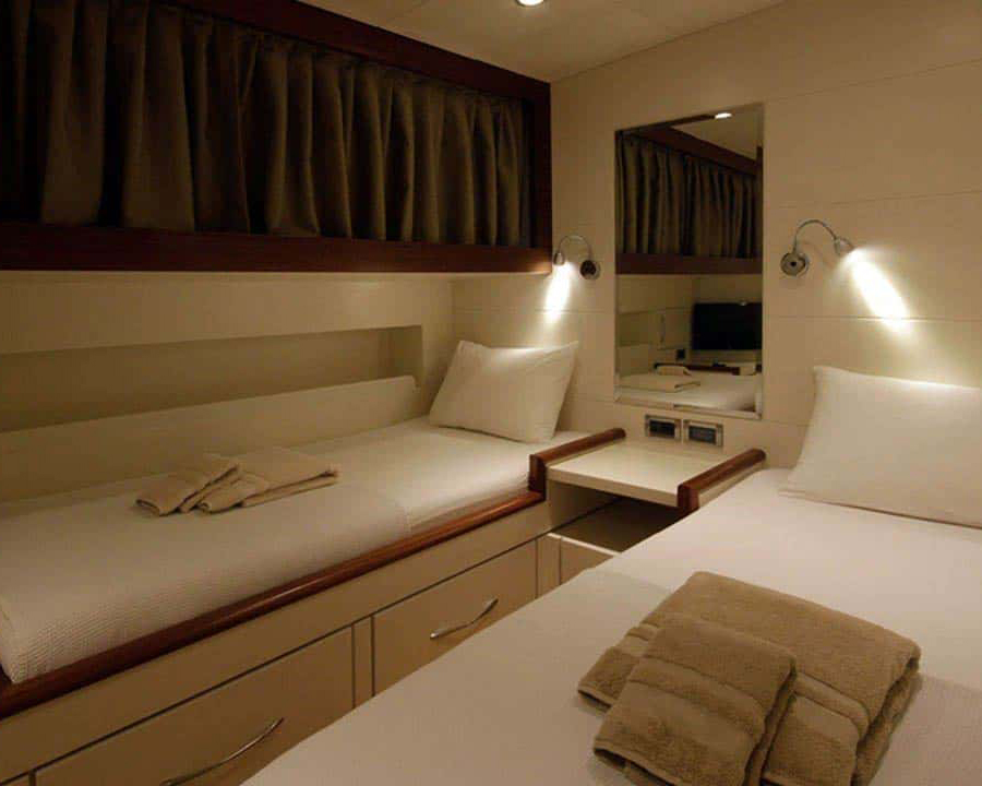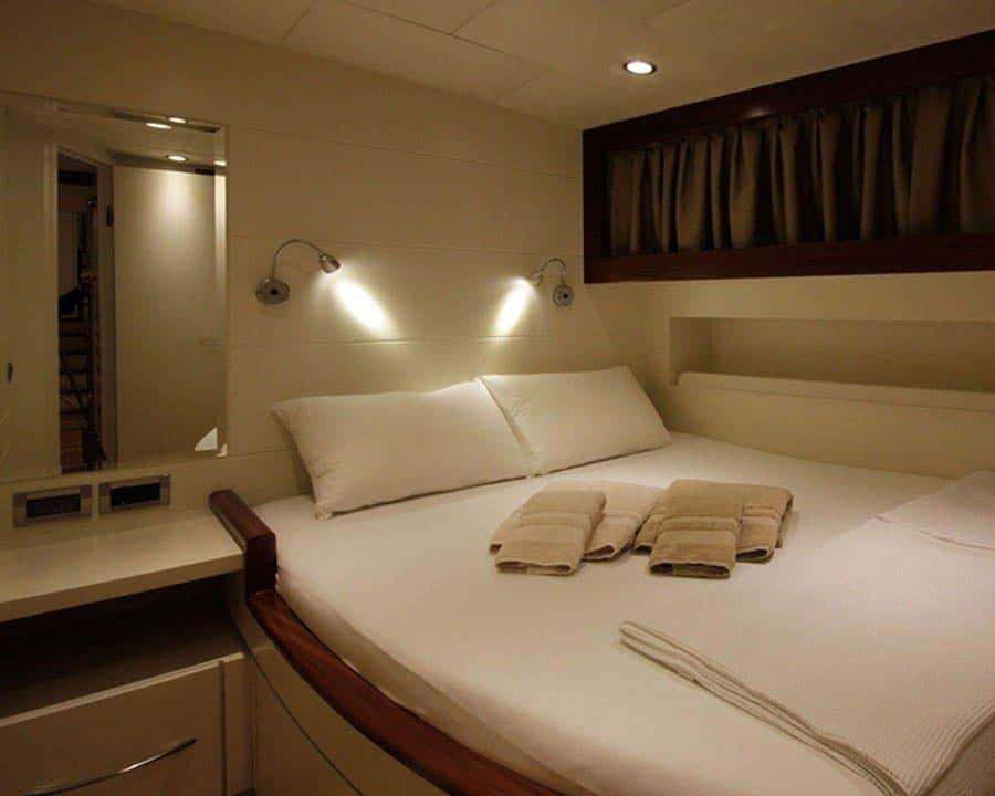 Das Schiff bietet Platz für bis zu 8 anspruchsvolle Gäste in vier durchdacht eingerichteten Kabinen, darunter zwei geräumige Master-Kabinen und zwei elegante Doppelkabinen. Jede Kabine bietet die perfekte Mischung aus Eleganz und Gemütlichkeit und dient als privater Rückzugsort mit modernen Badezimmern, individuell regulierbarer Klimaanlage, LCD-TV-Unterhaltungssystemen und hochwertiger Audioausstattung.