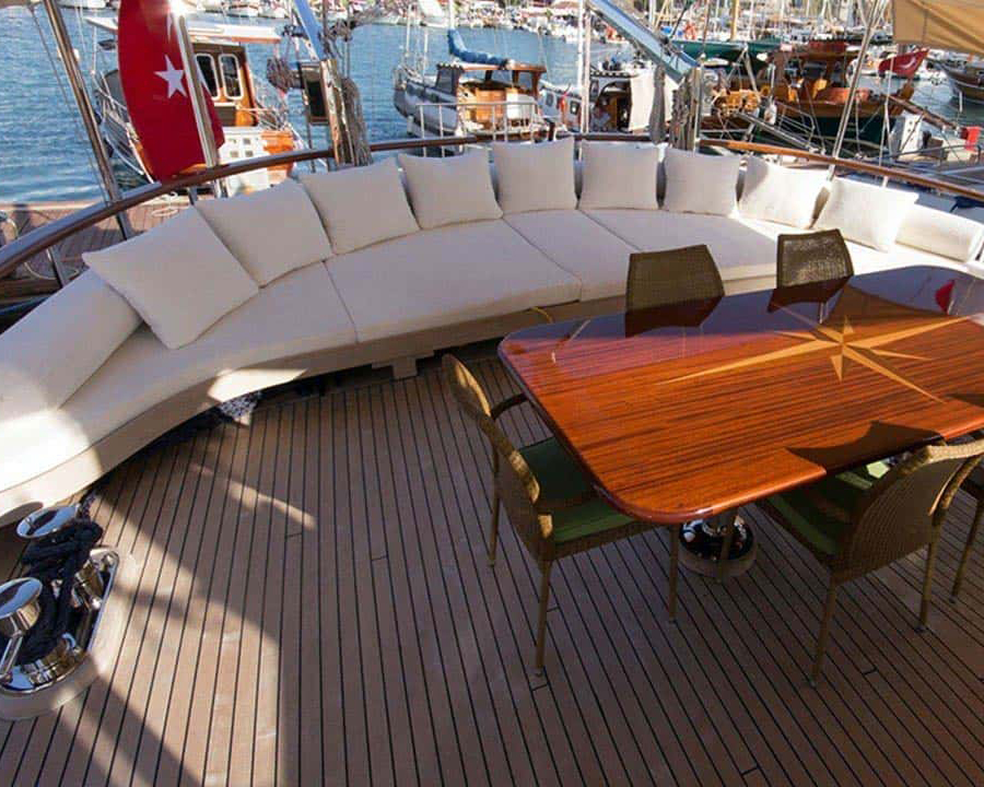 Die Außenbereiche des Schiffes sind ebenso beeindruckend und verfügen über einen großen Essbereich an Deck, der Platz für acht Gäste bietet, um unter dem Sternenhimmel im Freien zu speisen. Das Vorderdeck bietet einen geräumigen Loungebereich, der sich perfekt zum Sonnenbaden auf luxuriösen Sonnenmatratzen und zum Sternegucken auf bequemen Kissen eignet und die ideale Umgebung zum Entspannen und Geselligkeit bietet.