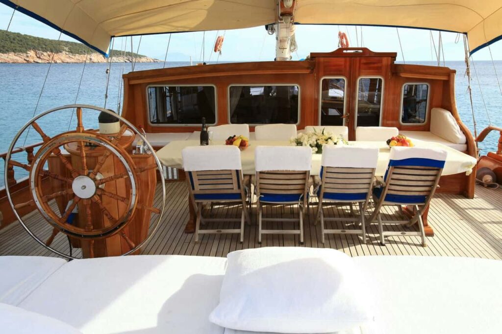 Die traditionelle Kombüse des Schiffes ist für die professionelle Zubereitung von Speisen voll ausgestattet, sodass der erfahrene Koch an Bord unvergessliche kulinarische Erlebnisse mit internationaler Küche und authentischen türkischen Spezialitäten zaubern kann. Die erfahrene vierköpfige Crew, bestehend aus Kapitän, Koch und Servicepersonal, sorgt während der gesamten Charter für einen professionellen Ablauf und aufmerksamen Gästeservice.