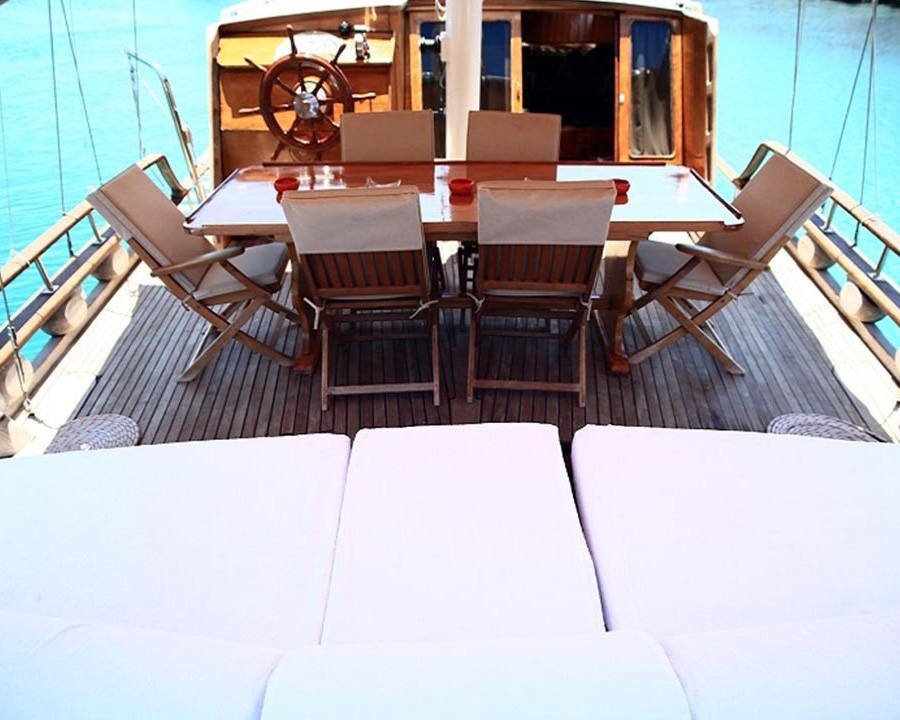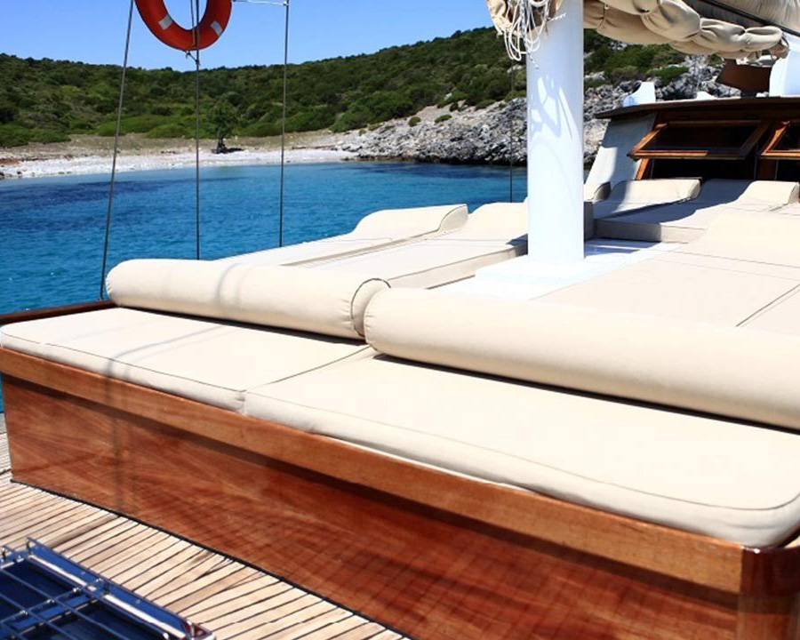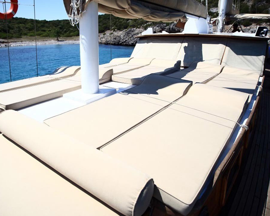 Das Schiff verfügt über einen durchgehenden Teakdeckboden, der eine sichere und bequeme Oberfläche zum Sonnenbaden und Entspannen bietet. Ausreichend Sonnenmatten und spezielle Bereiche sorgen dafür, dass alle Gäste die warme türkische Sonne genießen können, während das traditionelle Gulet-Design den ganzen Tag über sowohl Sonnen- als auch Schattenplätze für unterschiedliche Vorlieben bietet.