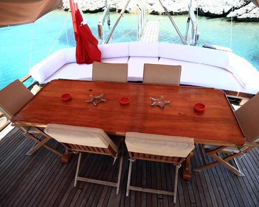 Die gut ausgestattete Innenausstattung der Laram umfasst einen geräumigen Salon mit bequemen Sitzgelegenheiten, einen formellen Essbereich und ein Unterhaltungssystem mit Fernseher, DVD-Player und Musikanlage für die Entspannung am Abend. In der voll ausgestatteten Küche kann die erfahrene Crew köstliche traditionelle türkische Gerichte und frische Meeresfrüchte zubereiten, während das Achterdeck mit gepolsterten Sitzbereichen und einem Essbereich im Freien zum Genießen von Mahlzeiten unter der mediterranen Sonne einlädt.