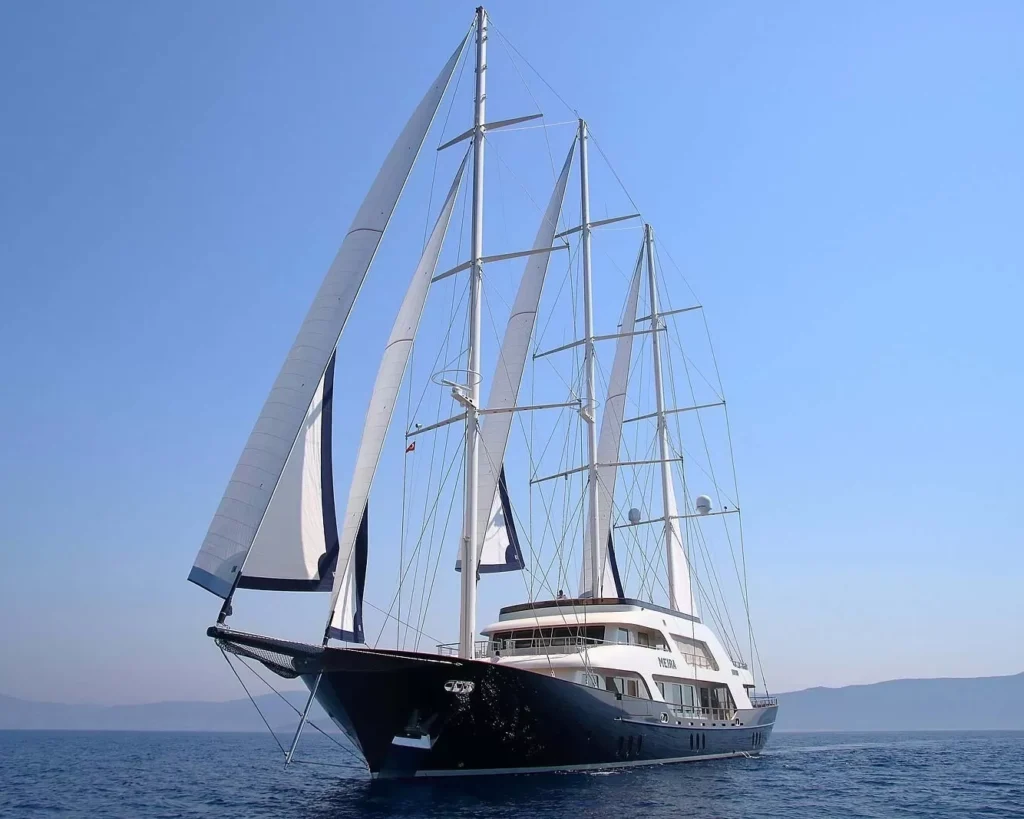 Die Gulet Meira ist ein 55 Meter langer, ultra-luxuriöser Motorsegler, der 2018 von der renommierten Werft Neta Marine gebaut wurde und zu den größten und beeindruckendsten Gulets gehört, die jemals in der Türkei gebaut wurden. Die Meira wurde vom preisgekrönten britischen Schiffsbauingenieur Evan K. Marshall entworfen und verfügt über einen Stahlrumpf, bietet Platz für 12 Gäste in 6 luxuriösen Kabinen und verfügt über Annehmlichkeiten auf Superyacht-Niveau, darunter einen Schönheitssalon, einen Massageraum, eine Sauna und einen Flybridge-Whirlpool.