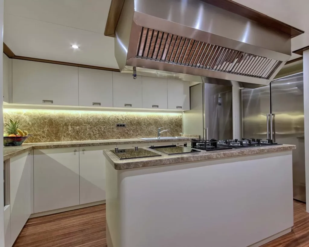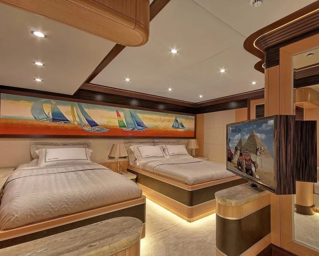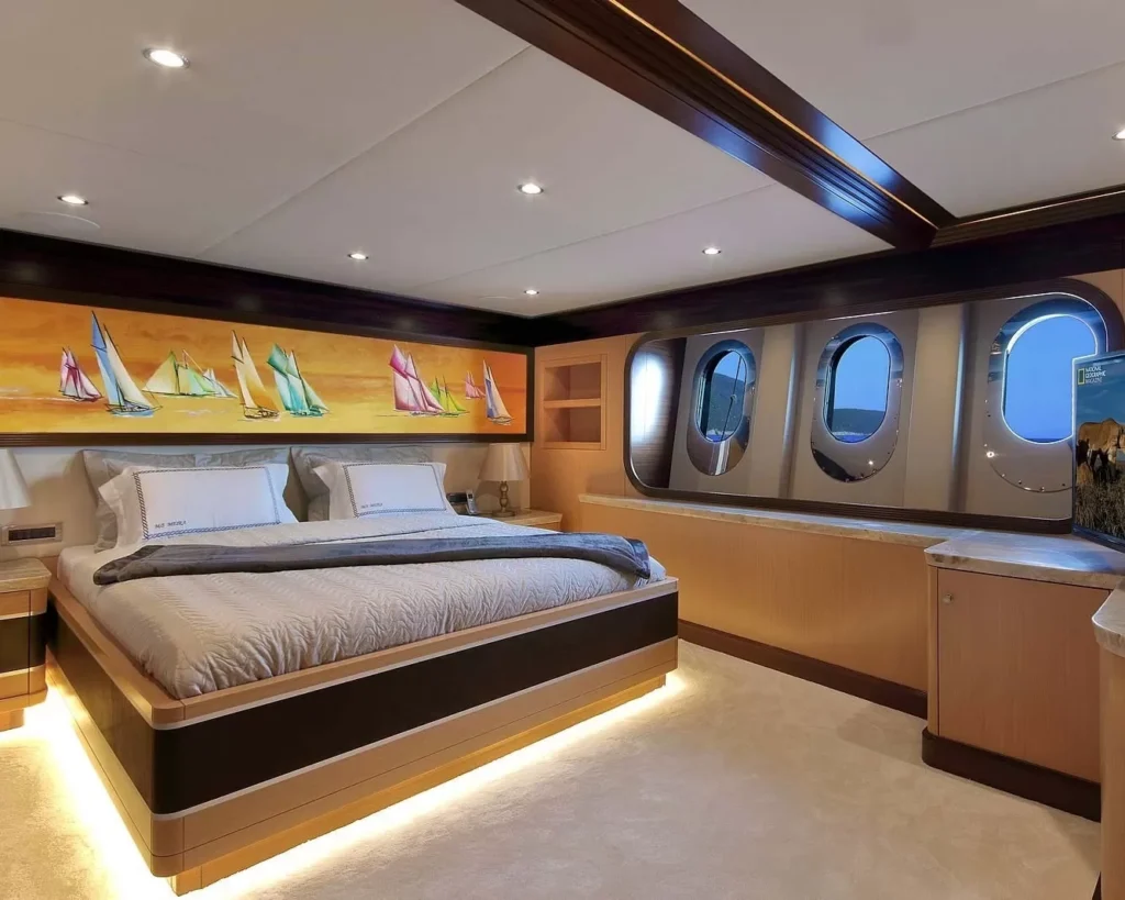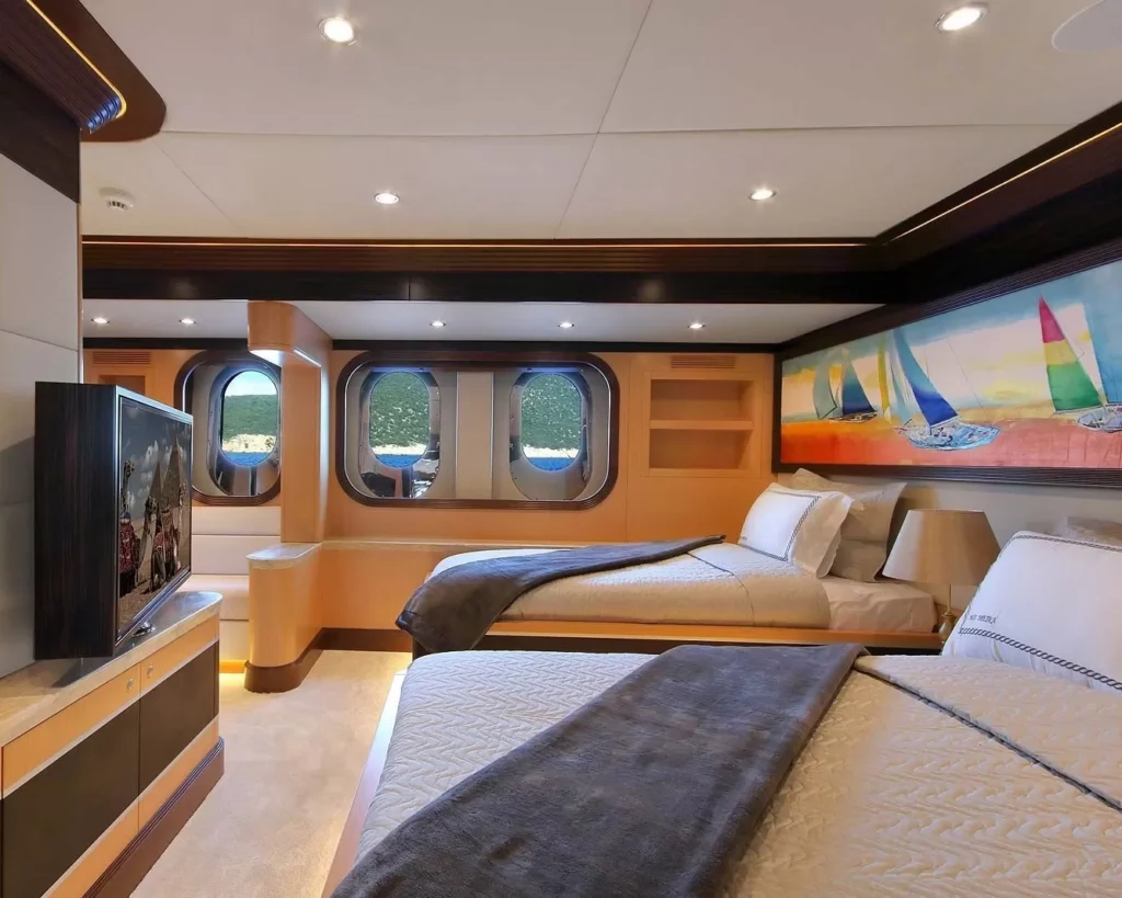 Das Schiff verfügt über sechs luxuriös ausgestattete Kabinen, die bis zu 12 Gästen unvergleichlichen Komfort bieten. Die Master-Suite auf dem Hauptdeck besticht durch ihre elegante Einrichtung mit Ebenholz, Aningeria, Leder und Marmor und verfügt über zwei begehbare Kleiderschränke, eine Minibar, eine Sitzecke mit großem Sofa und separate Badezimmer für Sie und Ihn. Drei VIP-Doppelkabinen und zwei flexible Zweibettkabinen, die zu Doppelkabinen umgebaut werden können, vervollständigen die Unterkünfte. Jede Kabine verfügt über ein fortschrittliches Hausautomationssystem, mit dem Klimaanlage, Beleuchtung, Vorhänge und Unterhaltungssysteme gesteuert werden können.