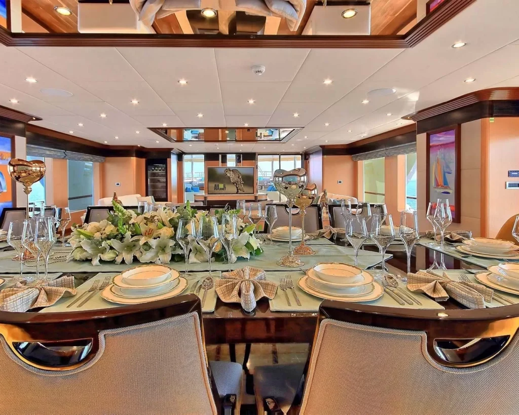 Das Hauptdeck verfügt über einen großen Salon mit Panoramafenstern, einen formellen Speisesaal für 12 Gäste und einen eleganten Barbereich. Das Interieur des Schiffes besticht durch handgefertigte Möbel aus edlen Hölzern und hochwertigen Materialien sowie durch speziell für die Meira angefertigte Walnussböden. Jedes Detail spiegelt die Liebe zum Handwerk und zum Luxus wider und schafft eine Atmosphäre von raffinierter Eleganz.