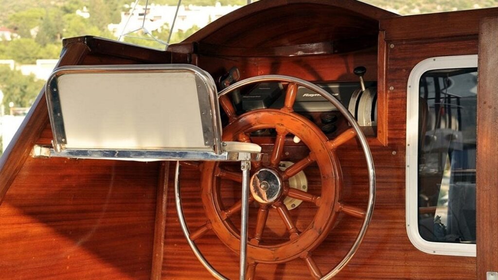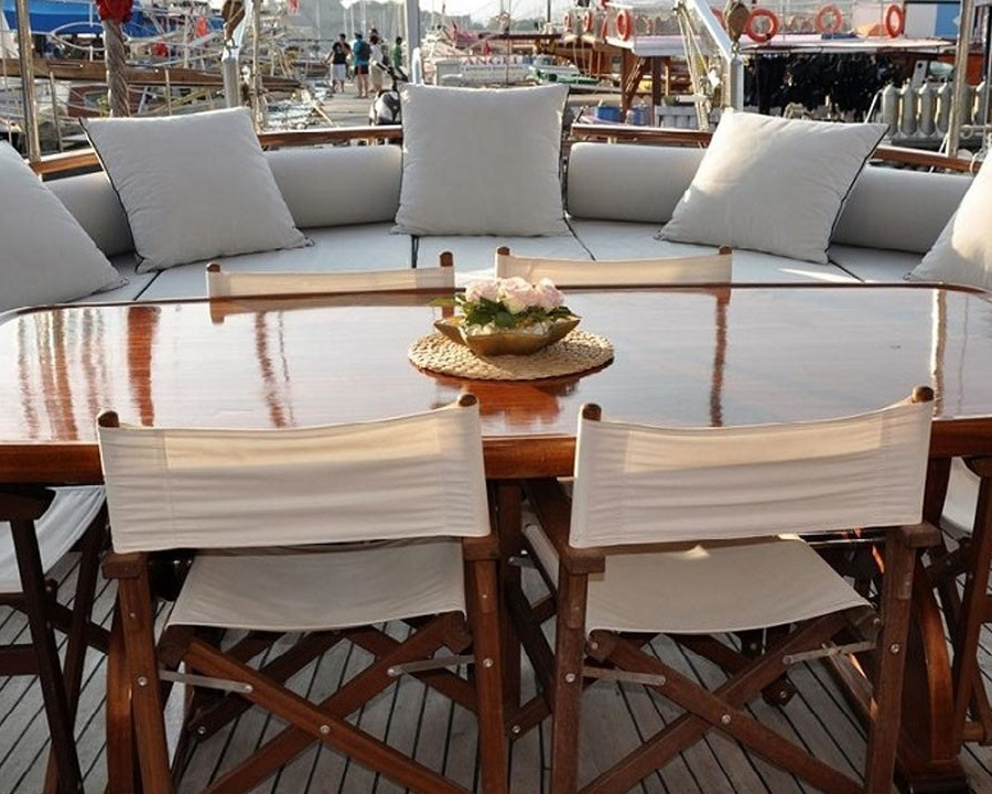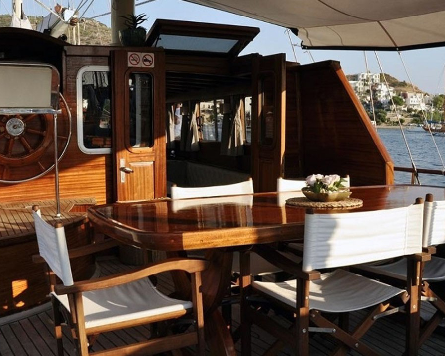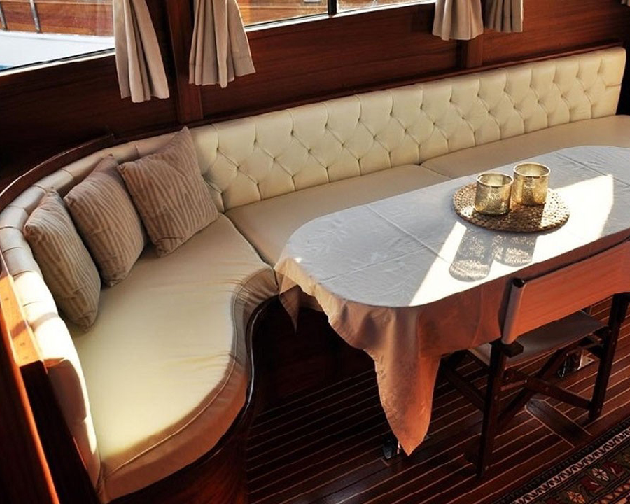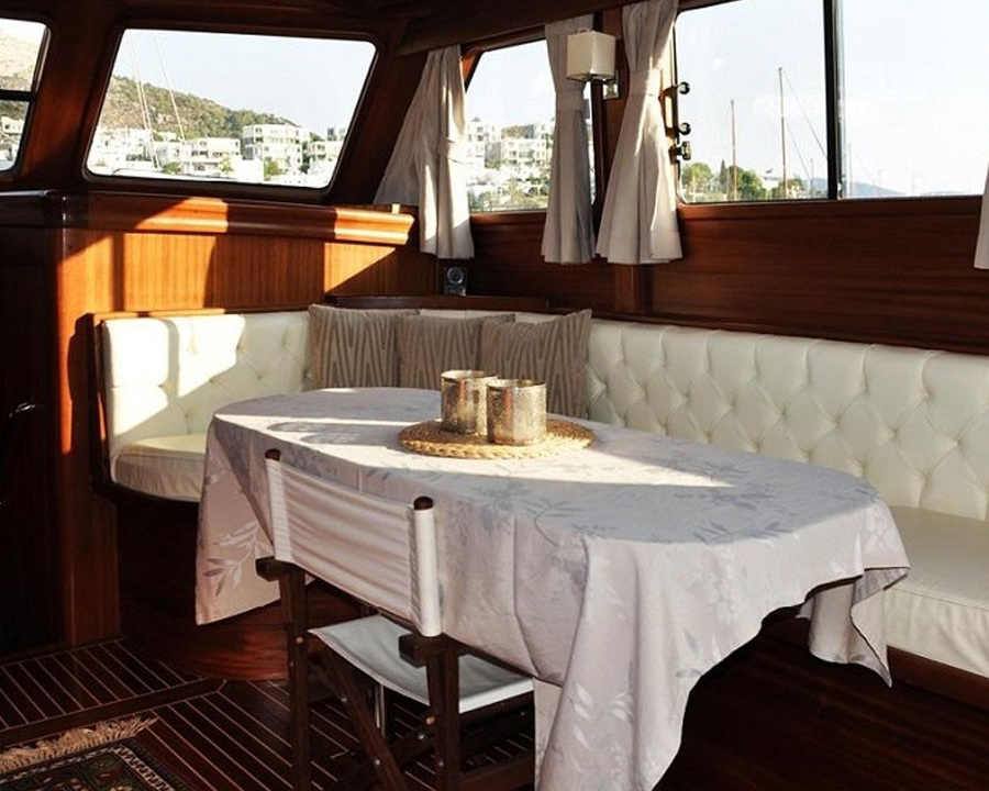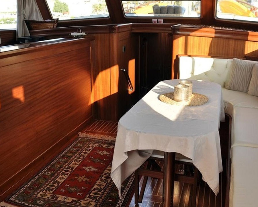 Der Innenraum des Schiffes verbindet traditionelle türkische Gastfreundschaft mit modernem Komfort und verfügt über einen einladenden Loungebereich mit Unterhaltungssystemen, bequemen Sitzgelegenheiten und einem separaten Essbereich. Große Fenster sorgen für viel Tageslicht und einen spektakulären Blick auf die Mittelmeerküste während Ihrer Reise.