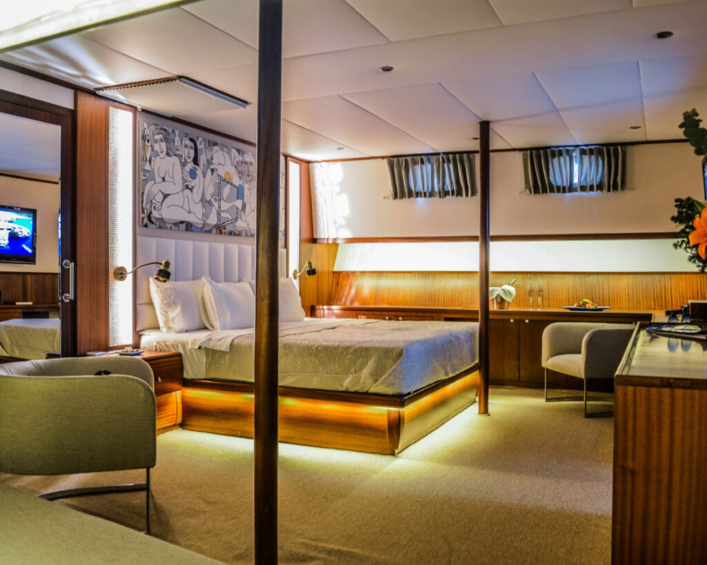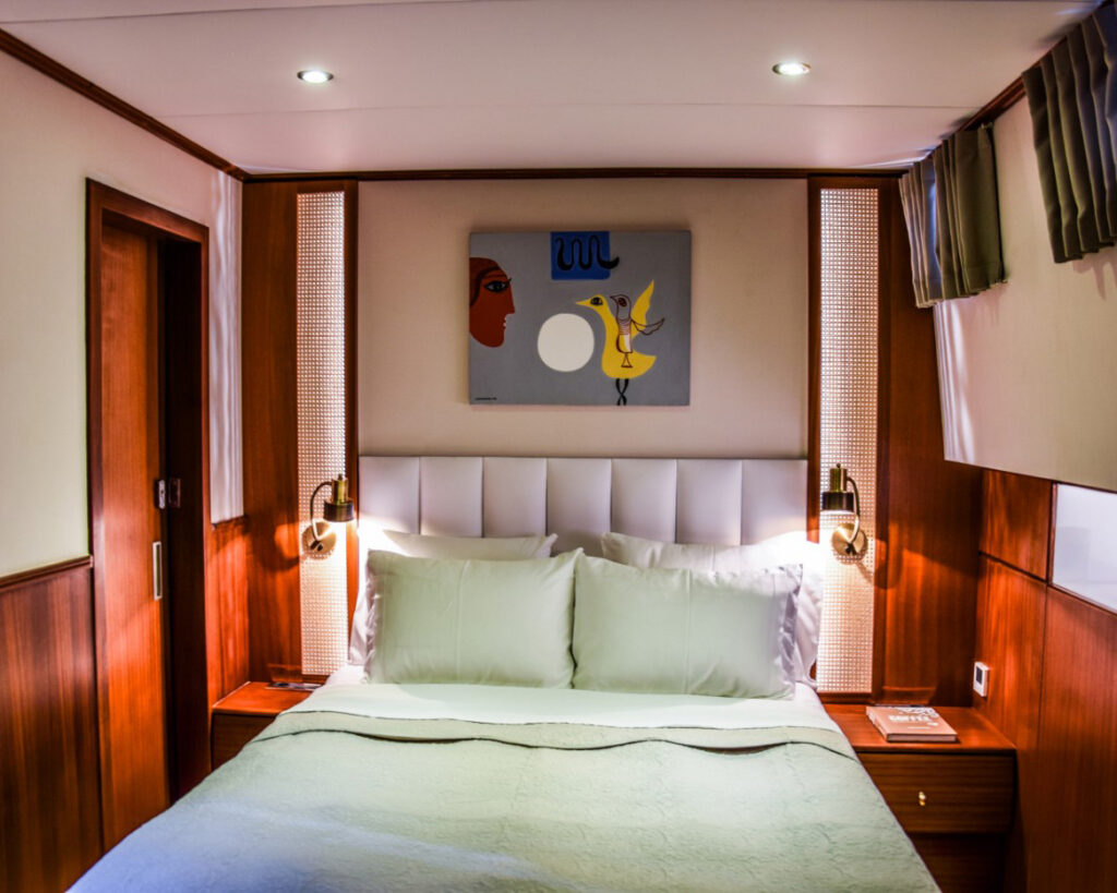 Das unverwechselbare Aussehen des Schiffes fällt sofort ins Auge, mit seinem charakteristischen blau gestrichenen Rumpf und der klassischen Ketsch-Takelage, die ihm eine beeindruckende und unverwechselbare Silhouette in jedem Ankerplatz verleihen. Die Papa Joe bietet Platz für bis zu 10 Gäste in fünf luxuriös ausgestatteten Kabinen, darunter eine opulente Master-Suite mit einem Kingsize-Bett und vier geräumige Doppelkabinen mit bequemen Queensize-Betten. Jede Kabine fungiert als privater Rückzugsort und ist mit einem eigenen Bad mit moderner Duschkabine, individueller Klimaregelung und erstklassigen Unterhaltungssystemen ausgestattet.