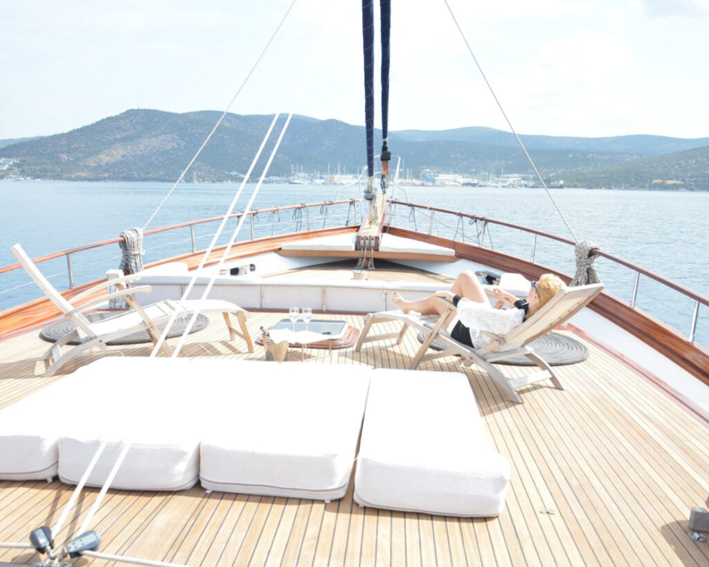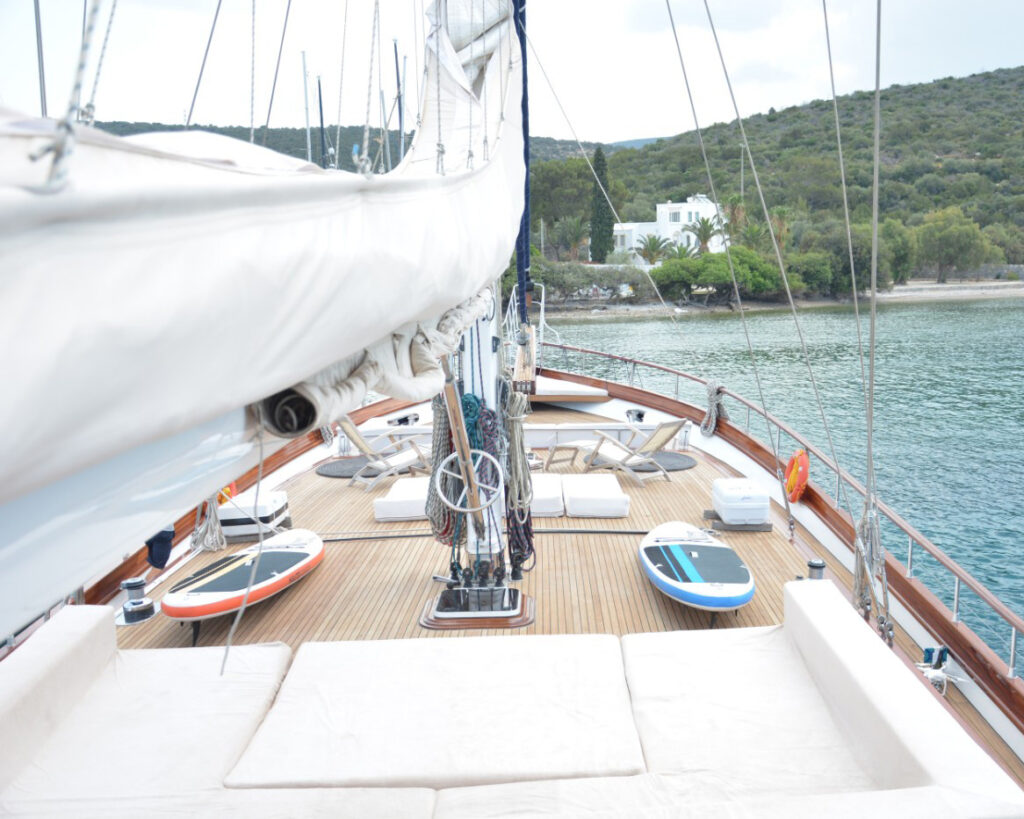 Das Außendesign des Schiffes wurde sorgfältig geplant, um sowohl Entspannung als auch Unterhaltung zu maximieren. Das großzügige Achterdeck verfügt über einen großen Esstisch, an dem bis zu 12 Gäste Platz finden, um unvergessliche Mahlzeiten im Freien zu genießen, ergänzt durch einen Chill-out-Bereich mit einladenden weißen Kissen und bequemen Liegestühlen. Breite Gangways führen zum geräumigen und völlig flachen Vorderdeck, das mit hochwertigen Sonnenliegen ausgestattet ist und über einen einladenden Sitzbereich verfügt, der sich perfekt für abendliche Zusammenkünfte unter dem Sternenhimmel des Mittelmeers eignet.