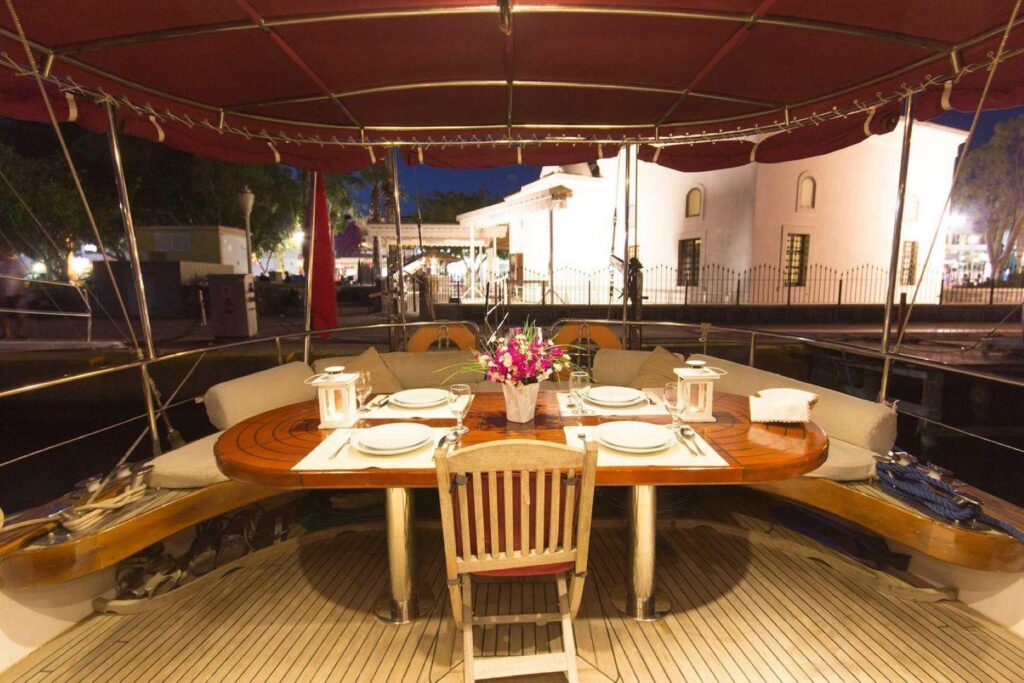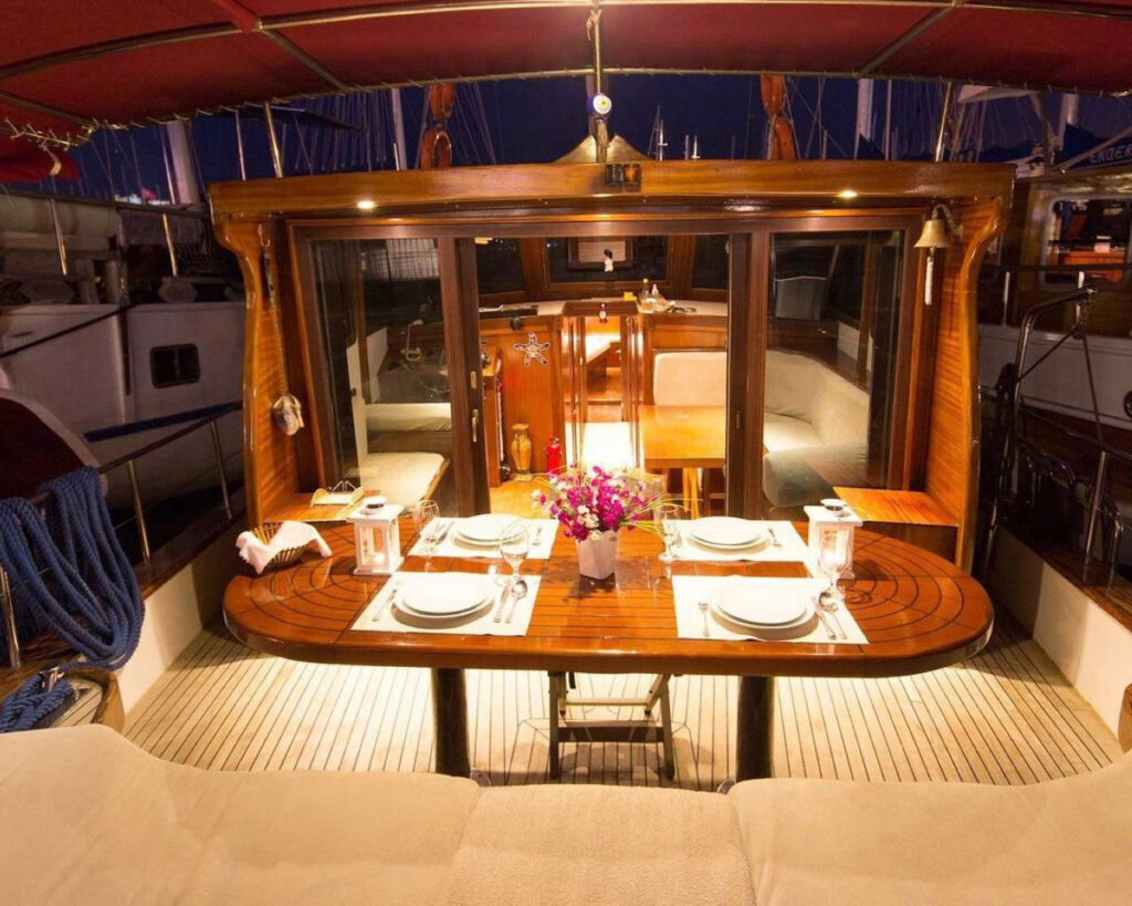 Die Gulet bietet eine Vielzahl von Unterhaltungsmöglichkeiten, darunter eine Bar, ein MP3-Musiksystem, Satellitenfernsehen und Freizeitausrüstung wie Tauch- und Angelausrüstung. Außerdem gibt es eine voll ausgestattete Küche und einen gemütlichen Salon.