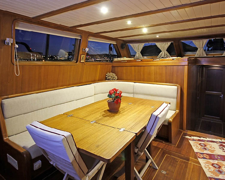 Der klimatisierte Salon ist das Herzstück des Schiffes und verfügt über komfortable Essgelegenheiten im Innenbereich, einen separaten Sitzbereich zum Entspannen und Unterhaltungssysteme wie Fernseher, DVD-Player und Musikanlage. Dieser einladende Raum verbindet traditionelle Designelemente mit modernen Annehmlichkeiten und schafft so die perfekte Umgebung für Geselligkeit, Essen und Unterhaltung bei Wetterumschwüngen oder zur Entspannung am Abend.