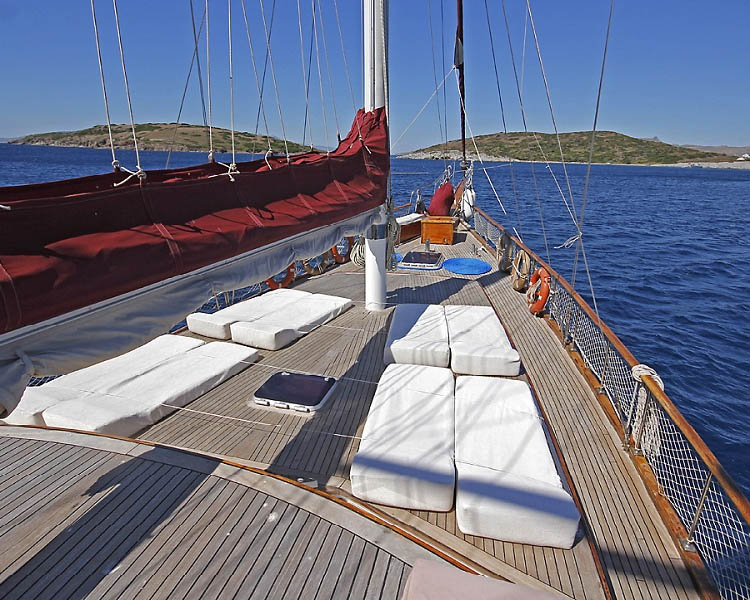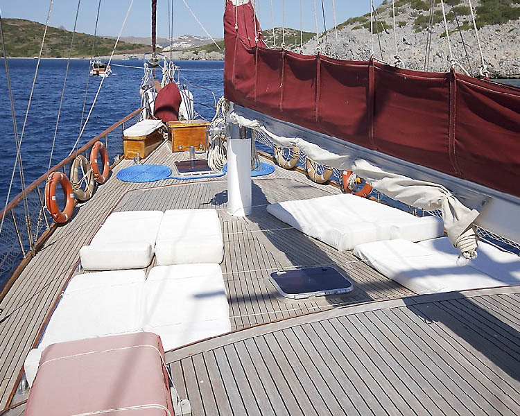 Das unverwechselbare Design des Schiffes zeichnet sich durch die klaren Linien einer ägäischen Ketch-Holzgulet aus, mit einem einzigartigen Heckspiegel, der es von modernen Schiffen unterscheidet. Die honigfarbene Innenverkleidung aus Kiefernholz schafft eine warme, maritime Atmosphäre, während die traditionelle Ketch-Takelage authentische Segeleigenschaften und klassische Ästhetik bietet, die den Geist traditioneller türkischer Handwerkskunst verkörpert.
