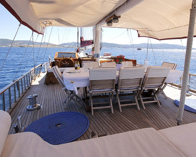 Die Außenbereiche sind durchdacht für das Leben im Mittelmeerraum gestaltet und bieten mit ihren großzügigen Decksflächen mehrere Zonen für unterschiedliche Aktivitäten. Das Achterdeck verfügt über einen großen Esstisch, der sich perfekt für Mahlzeiten im Freien eignet, während erweiterte Sitzbereiche mit Polstern zum Entspannen und Geselligkeit einladen. Die traditionelle Segelausrüstung trägt zum authentischen Erlebnis bei und ermöglicht es den Gästen, bei geeigneten Bedingungen an echten Segeltechniken teilzunehmen oder diese zu beobachten.
