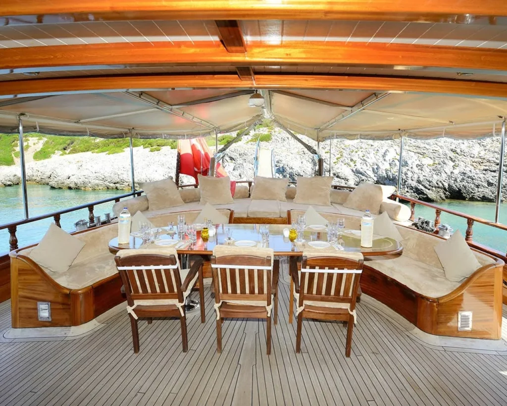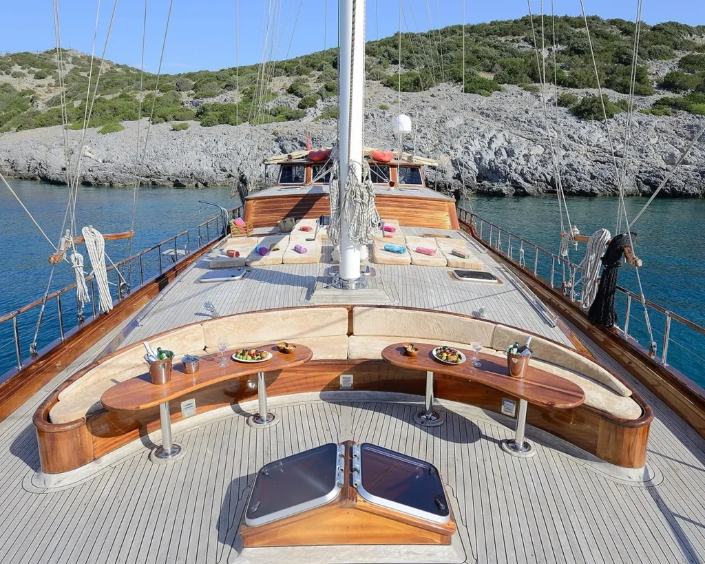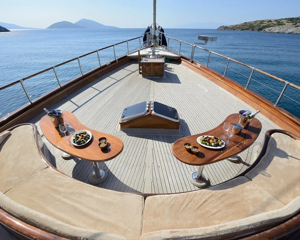Die Außenbereiche des Schiffes sind ebenso beeindruckend und verfügen über großzügige Deckflächen, die sowohl für Entspannung als auch für Unterhaltung konzipiert sind. Das Achterdeck verfügt über eine massive Sonnenliege im echten Gulet-Stil sowie eine komfortable Essbereich im Freien, der Platz für 10 Gäste unter dem Sternenhimmel oder unter einem optionalen Bimini-Verdeck bietet. Das weitläufige Vordeck bietet großzügige Liege- und Sonnenbereiche, während das erhöhte Deckshaus über zusätzliche Sonnenliegen und maßgefertigte halbrunde Cocktailtische verfügt, die sich perfekt für Aperitifs bei Sonnenuntergang eignen.