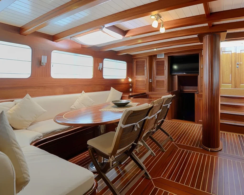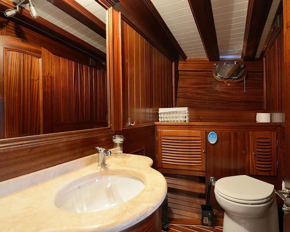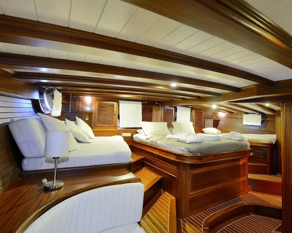 Die Zephyria II bietet Platz für bis zu 12 Gäste in 6 eleganten Kabinen mit flexiblen Schlafmöglichkeiten. Die Unterkunft umfasst 2 geräumige Master-Suiten (eine mit einem 150 x 210 cm großen Bett und eine mit einem 180 x 200 cm großen Kingsize-Bett sowie zusätzlichen Einzelkojen für Kinder), 2 komfortable Doppelkabinen und 2 Zweibettkabinen, die auf Wunsch in Kingsize-Doppelbetten umgewandelt werden können. Jede Kabine verfügt über ein eigenes Badezimmer mit Dusche aus Natursteinmosaik, individuell regulierbare Klimaanlage, Flachbild-LED-Fernseher mit DVD-Player, elektrische Toiletten und Haartrockner. Diese flexible Konfiguration macht die Zephyria II perfekt für Familien mit Kindern, Mehrgenerationen-Gruppen oder luxusliebende Freunde, die gemeinsam reisen.