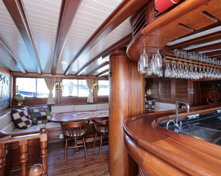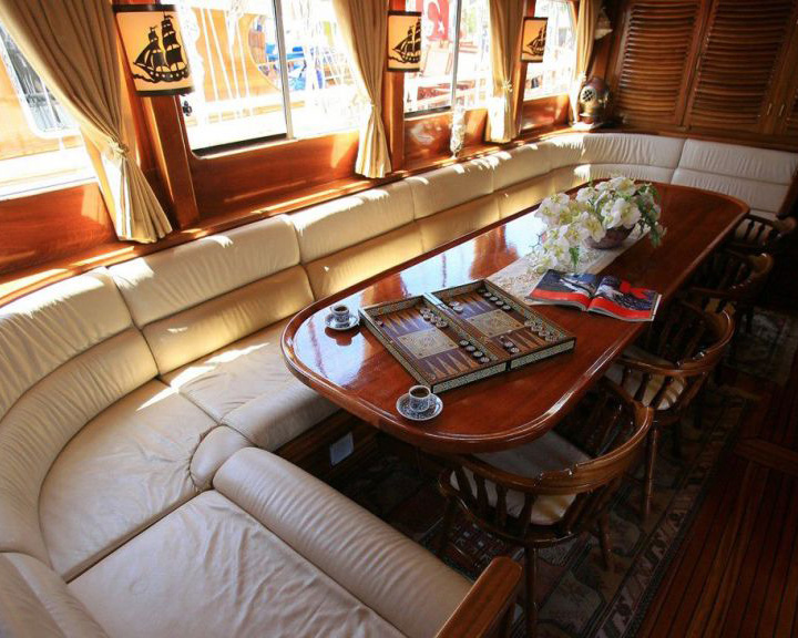 Aegean Clipper'ın iç tasarımı, çağdaş imkanlar ve konfor özelliklerle güçlendirilmiş nefis ahşap işçiliği ve geleneksel Türk gulet stilini sergiler. Geniş, klimalı salon panoramik pencereler, zarif oturma alanları, TV, DVD oynatıcı ve iPod bağlantılı premium müzik sistemi dahil eğlence sistemleriyle rahat bir sığınak sağlar. Salon ayrıca tüm misafirleri rahatça ağırlayan resmi yemek alanı içerir ve grup yemekleri ile sosyalleşme için ideal mekan yaratır.