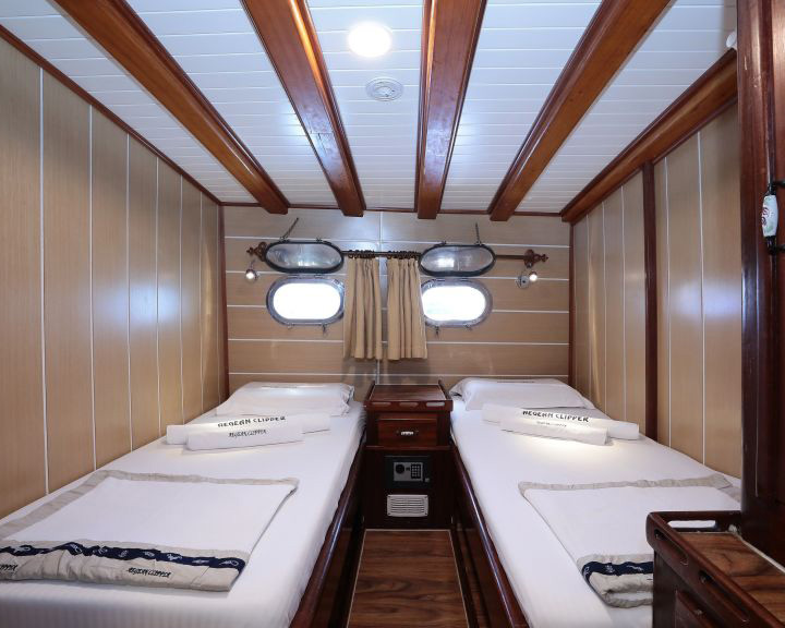 Bu büyük kapasiteli tekne, bir master süit, dört çift kişilik kabin ve altı ikiz kabin gibi mükemmel konaklama seçenekleri karışımı ile on bir güzel döşenmiş kabinde 22 misafir kapasitesine sahiptir. Her kabin, kapalı duş, WC ve modern armatürler içeren özel banyo, bireysel kontrollü klima ve düşünceli kolaylıklarla donatılmış özel sığınak işlevi görür. İyi tasarlanmış kabin düzeni, mükemmel havalandırma, doğal ışık ve boyunca şık mobilyalarla tüm misafirler için optimal konfor ve gizlilik sağlar.