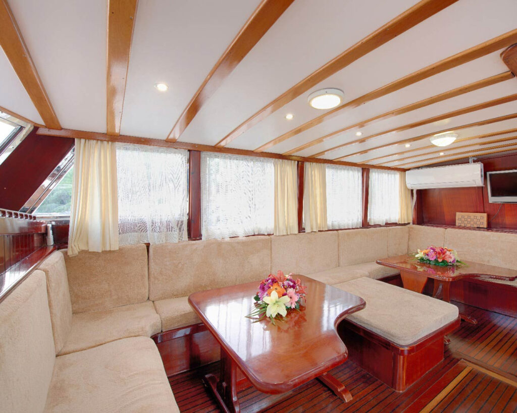 Almira'nın iç tasarımı, okuma, dinlenme ve rahatsız edilmeden rahatlama için bol alan sağlayan rahat salon alanları ile klasik gulet geleneklerini sergiliyor. Ana buluşma alanı, televizyon, DVD oynatıcı ve müzik sistemi dahil modern eğlence sistemleri ile desteklenen resmi yemek masası etrafında geleneksel oturma düzenlemeleri sunuyor. Modern cihazlar bulunan tam donanımlı galley mükemmel yemek hazırlığını mümkün kılarken buzluk, minibar ve su yapıcı gibi özellikler tatil boyunca kolaylık ve konfor garanti ediyor.