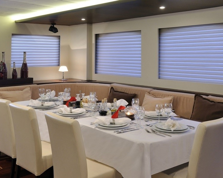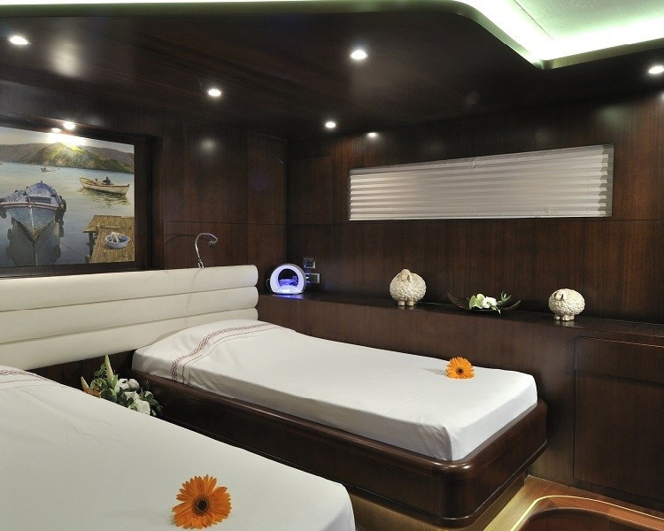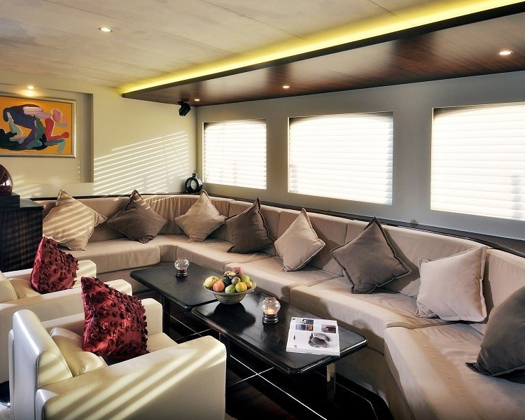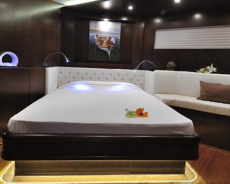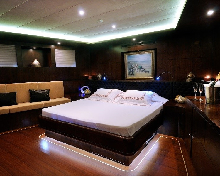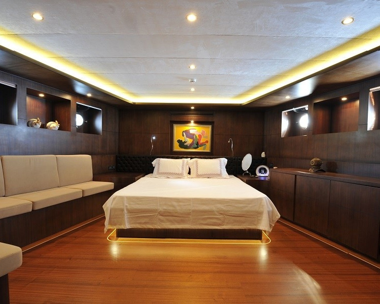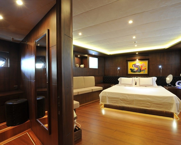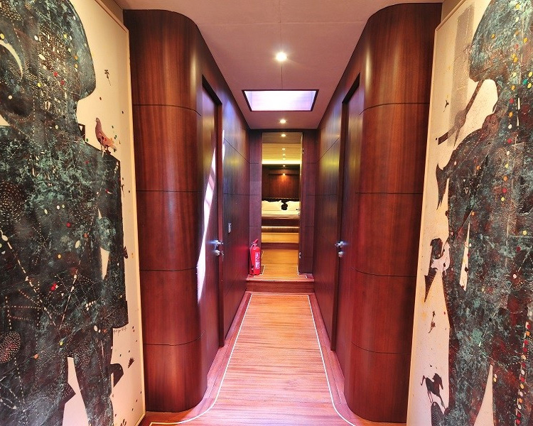 Gemi, üç ferah master kabin ve iki iyi döşenmiş twin kabin sunarak beş lüks kamarada 10 misafiri eşsiz konforda ağırlar. Her kamara özenle seçilmiş ünlü sanat eserlerini sergiler ve bireysel klima, i-pod bağlantı istasyonlu plazma TV'ler, cam kapalı duşlar bulunan sofistike en-suite olanaklar ve özel sipariş donanım ile makyaj üniteleri dahil en yüksek lüks standartlara sahiptir. Geminin iç tasarımı, her alanda anlaşılır lüksü ifade eden güzel malzemeler ve zarif tarzı sergiler.