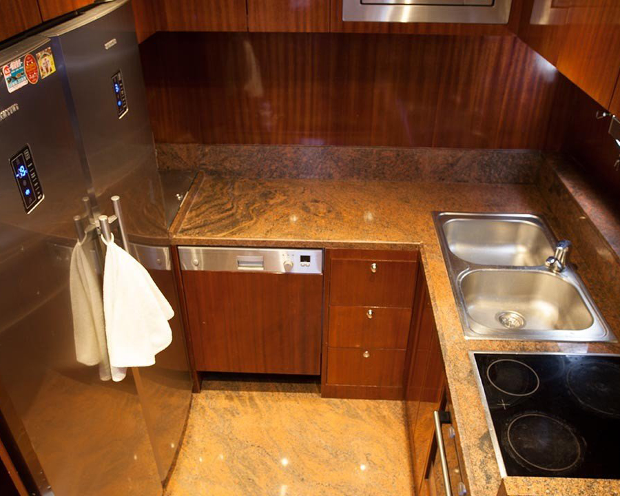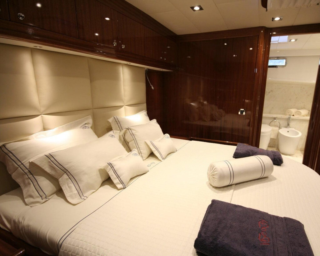 Gemi, king-size yataklı iki master kabin, bir double kabin ve gerektiğinde dönüştürülebilen bir twin kabin ile esnek lüks düzenlemeler sunarak dört güzel şekilde döşenmiş kabinde 8 misafiri ağırlar. Her kabin, mermer en-suite banyolar, bireysel kontrollü klima, uydu alıcılı LCD TV ve her yerde premium ses sistemleri ile özel sığınak olarak hizmet verir.
