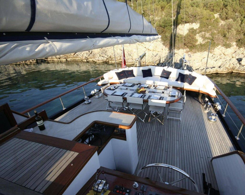 Geminin dış alanları da aynı derecede etkileyici olup yemek ve dinlenme için çoklu güverte alanları bulunan ayırt edici siyah gövde tasarımı sergiler. Kıç güverte 8 misafir için rahat açık hava yemek olanağı sunarken, baş güverte bireysel güneş yatakları ve yıldızlar altında güneşlenme ve akşam kokteylleri için mükemmel lüks hilal şeklinde günlük yatak içerir.