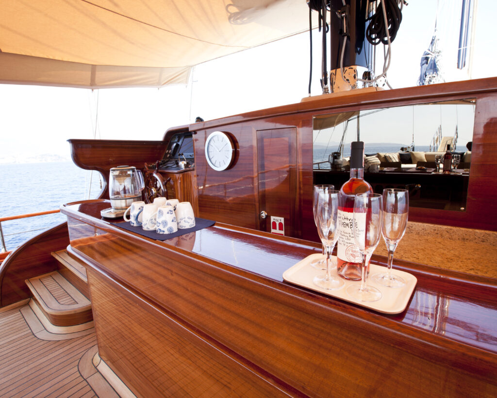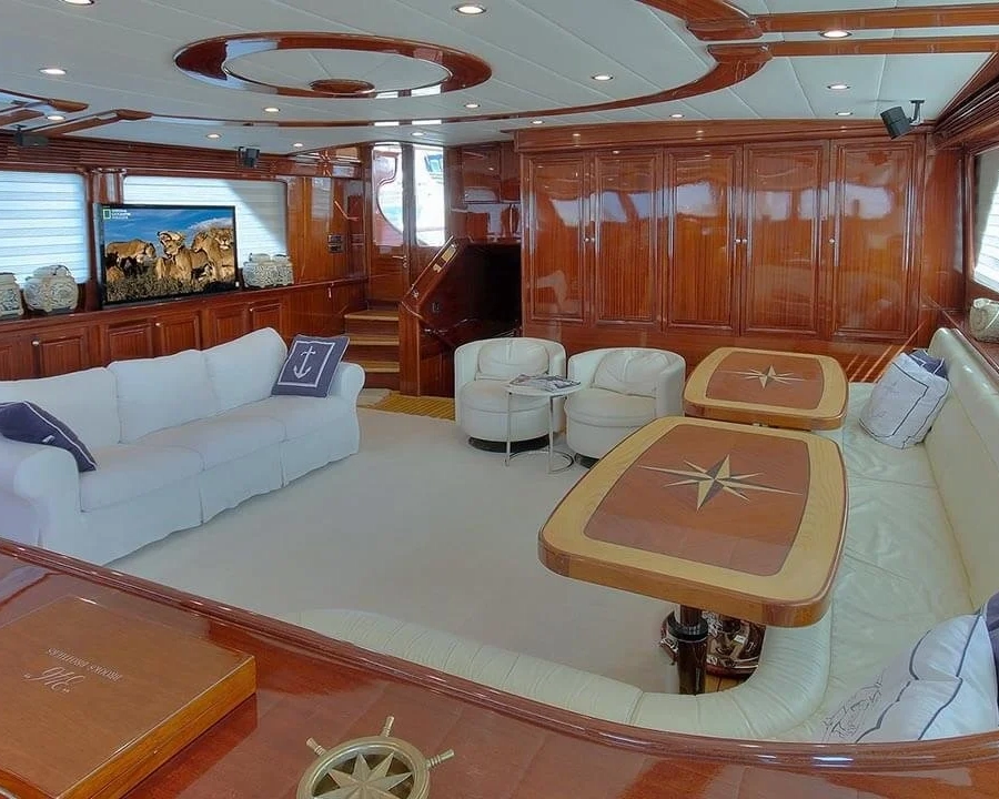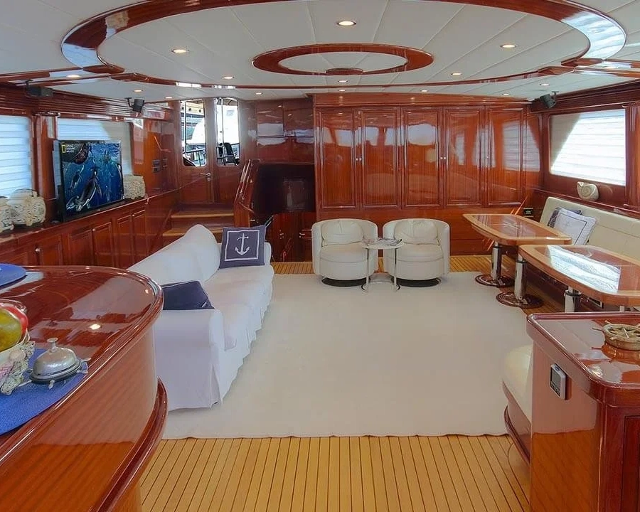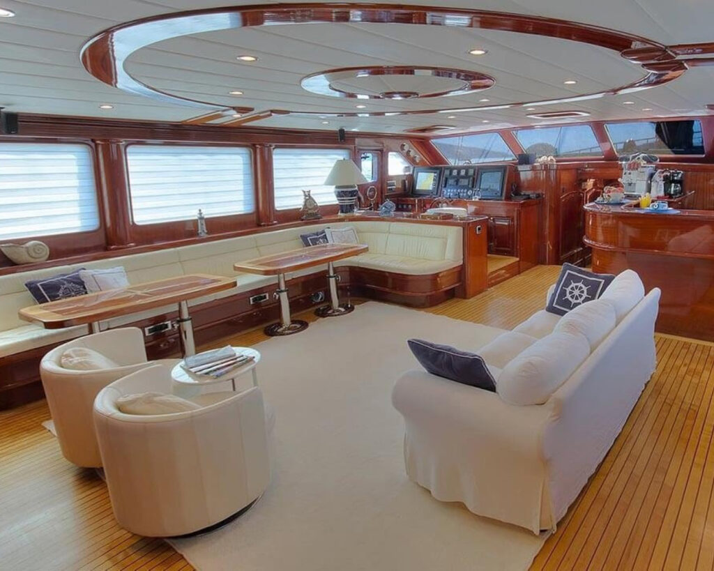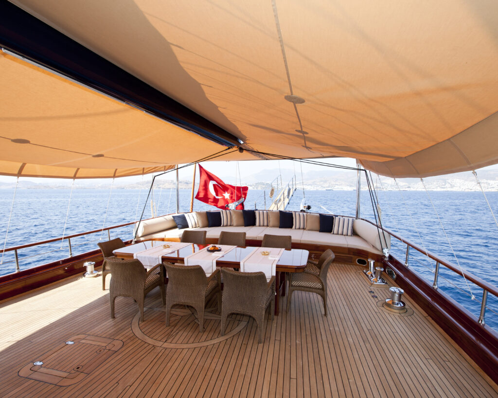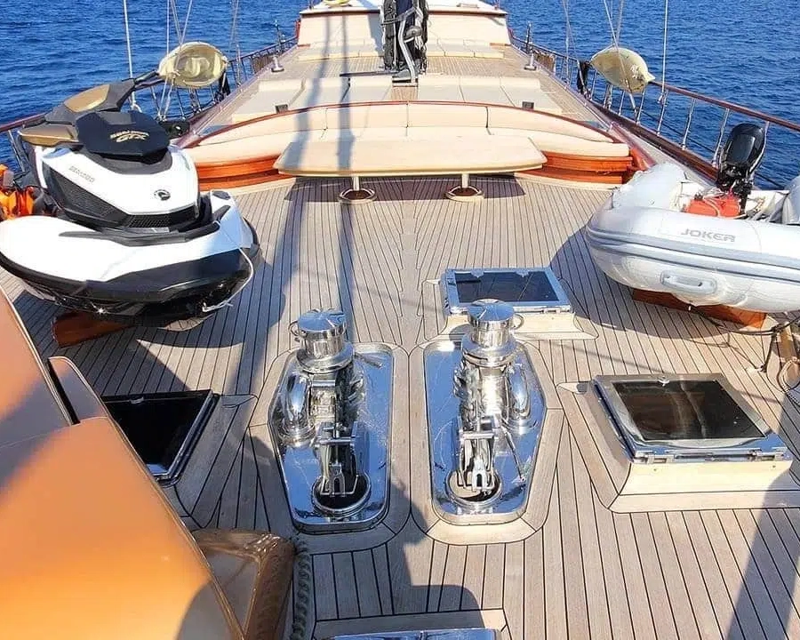 Teknenin dış alanları da eşit derecede etkileyici olup hem rahatlama hem eğlence için tasarlanmış geniş güverte alanları sunuyor. Üst güverte rahat minderlerde güneşte dinlenmek için bol alan sağlarken kıç güverte gölgeli oturma alanları ve açık hava yemek olanakları sunuyor. Hem ön hem kıç güvertelerdeki güneş şilteleri ve tenteler misafirlerin tercih ettikleri şekilde Akdeniz güneşinin tadını çıkarmaları veya rahat gölge aramalarını garanti ediyor.