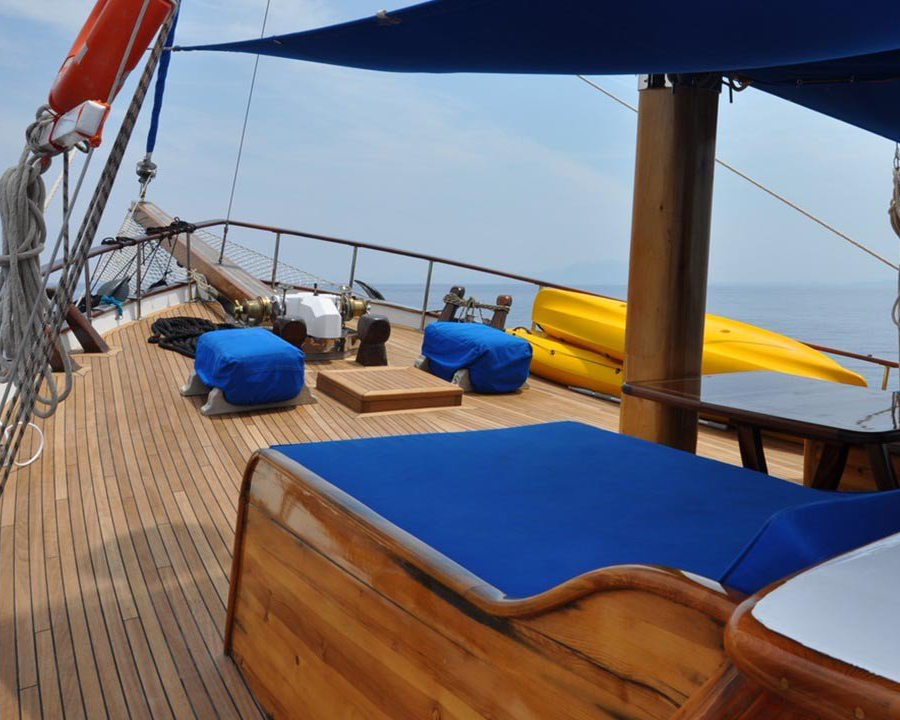 Geminin dış alanları, güneşlenme, dinleme ve açık hava yemekleri için rahat güverte alanları sunarak Türkiye'nin muhteşem doğal çevresi ile bağlantıyı en üst düzeye çıkarmaktadır. Kıç güverte akşam buluşmaları için ideal bir alan sağlarken, baş bölümü gizli koyların ve antik kıyıların nefes kesici manzarasının tadını çıkarmak için ek alan sunar.