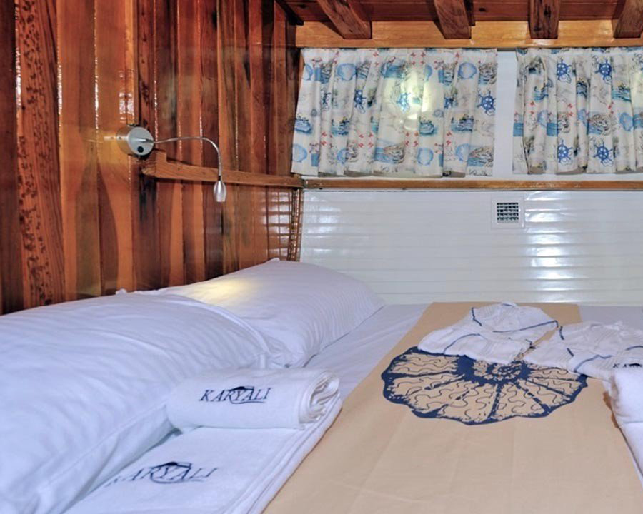 Gulet Karyalı 27 metre uzunluğunda olup 16 misafir kapasitesine sahiptir. Üç özenle tasarlanmış kabin bulunur: bir master kabin (geniş çift yatak) ve gerektiğinde çift yatak olarak düzenlenebilen iki ikiz yataklı kabin. Her kabin en-suite banyo, bireysel iklim kontrolü ve bol depolama alanı içerir.