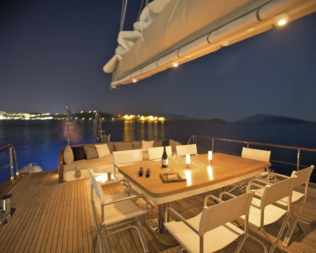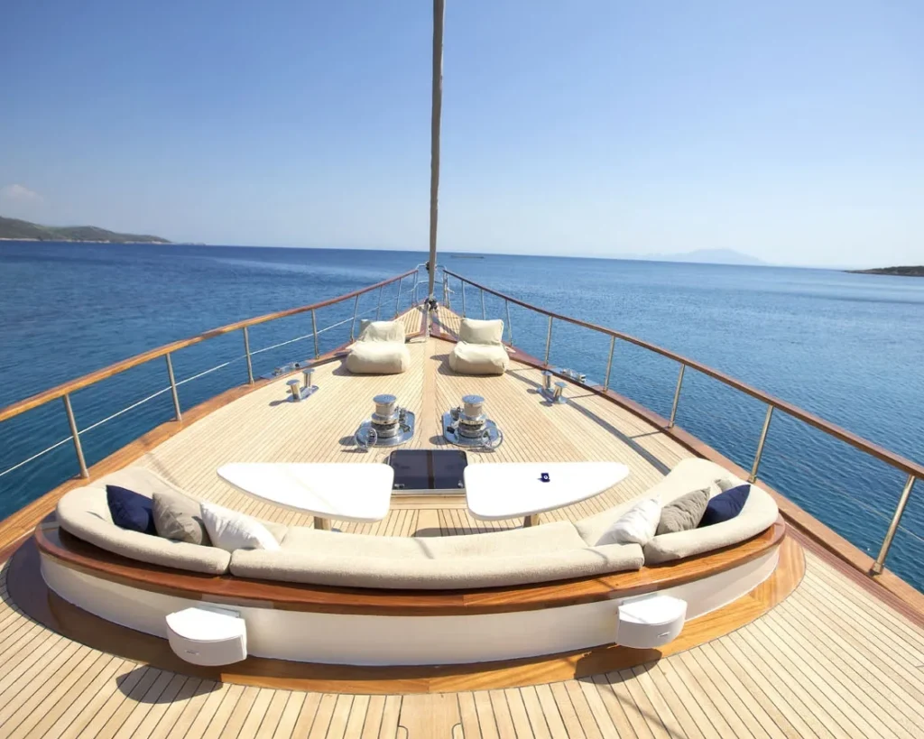 Geminin dış alanları da aynı ölçüde etkileyici olup her köşesinde delüks tik güverteler ve dinlenme ile eğlence için sayısız alan bulunur. Geniş kıç güverte açık hava yemek seçenekleri ve cömert oturma alanları sunarken, 360° çevresel güverteler kabin üzerindeki yumuşak güneş minderleri ve baş güvertedeki ek oturma alanlarına götürür - gün batımı kokteylleri ve kıyı manzaraları için ideal yerler.
