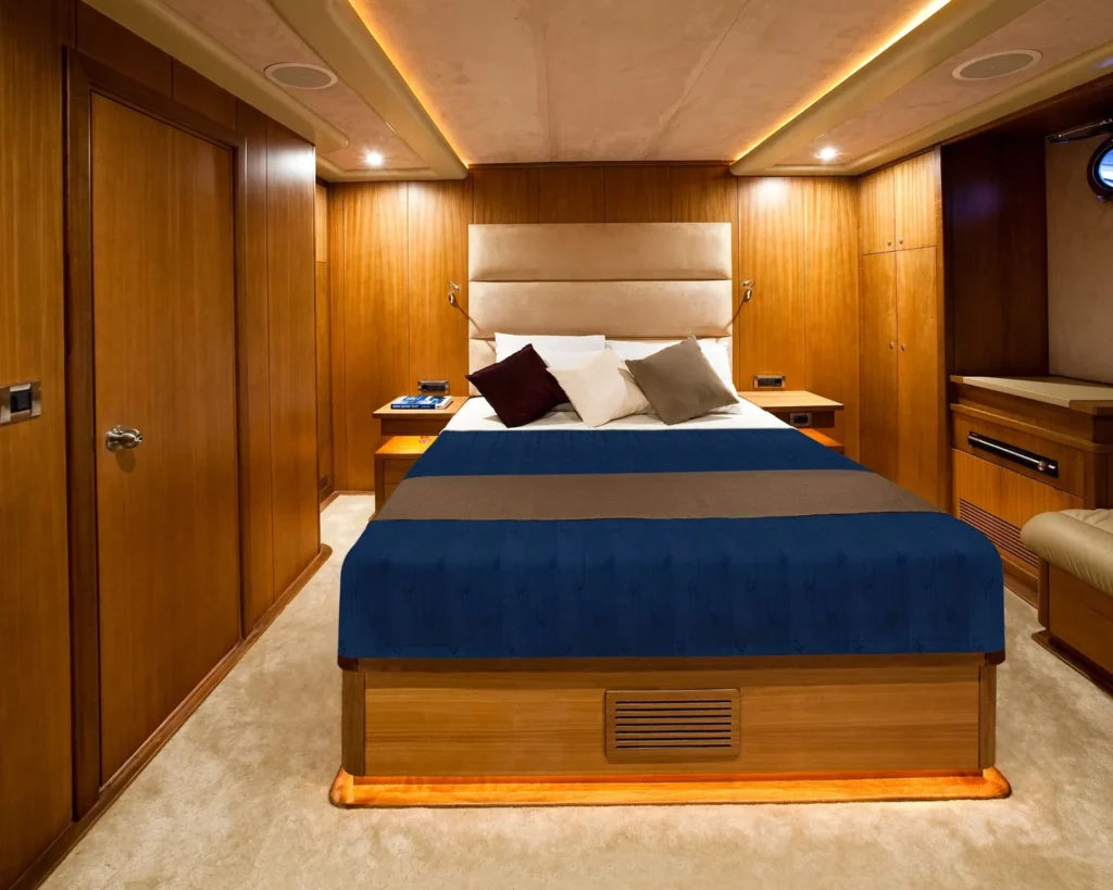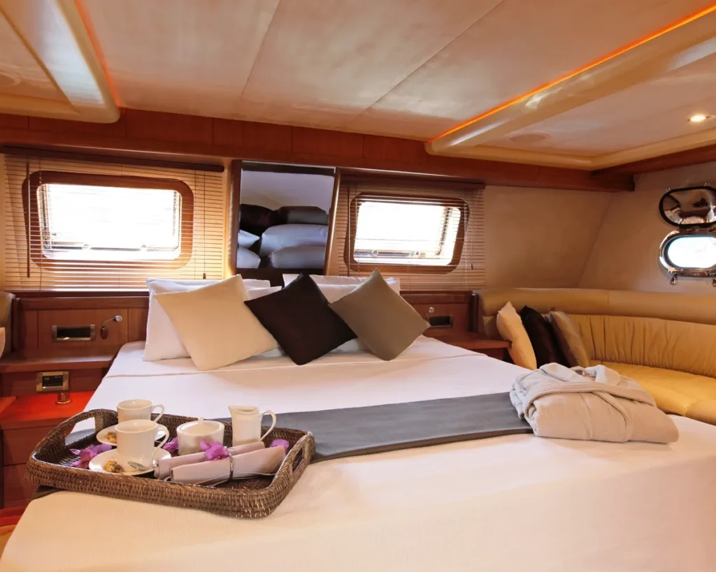 Bu eşsiz gemi, dört delüks kabinde 8 misafiri ağırlamaktadır. Tam genişlik master kabin king-size yatak ve iki kanepe içerirken, baş bölümde yer alan tam genişlik VIP kabin queen-size yatak sunar. Ayrıca bir double kabin ve bir twin kabin ile konaklama seçenekleri tamamlanır. Her kabin, walk-in duşlar bulunan özel banyolar, 24 saat kullanılabilen bireysel klima kontrolü, DVD oynatıcılı LCD TV'ler ve ev rahatlığı yaratan premium stereo müzik sistemleri ile özel bir sığınak atmosferi yaratır.