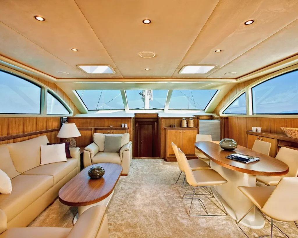 Miss B'nin iç mekanları, açık plan salon ve yemek alanındaki büyük pencerelerden içeri süzülen bol doğal ışık ile çağdaş nötr dekorasyon sergiler. Sancak tarafındaki resmi yemek alanı tüm misafirleri rahatça ağırlarken, iskele tarafındaki lounge bölümü konforlu oturma imkanı sunar.